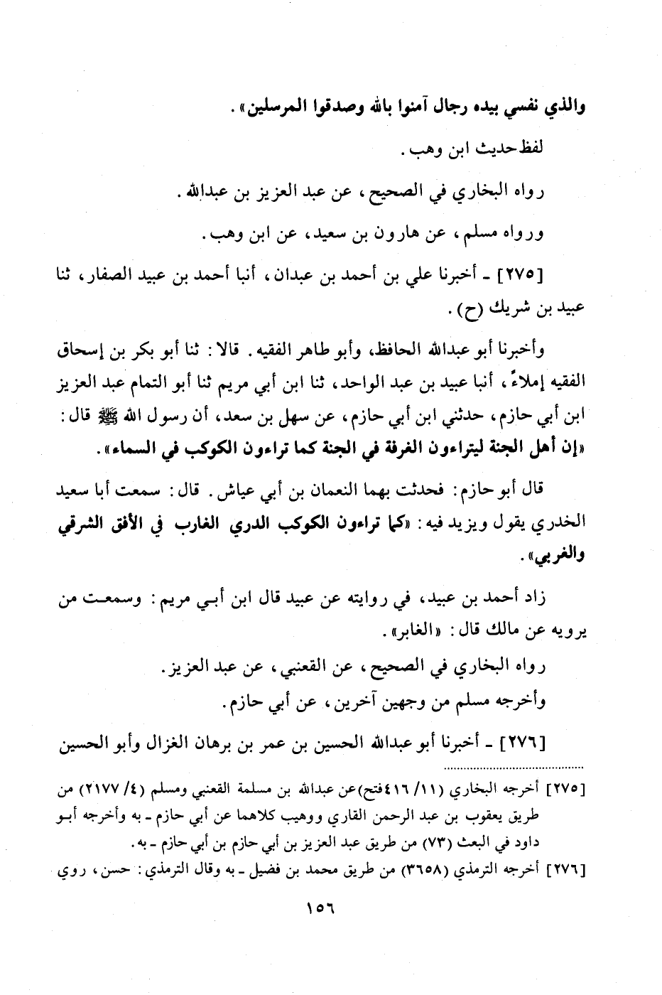 275 - (249) أَخْبَرَنَا عَلِيُّ بْنُ أَحْمَدَ بْنِ عَبْدَانَ، أَنْبَأَ أَحْمَدُ بْنُ عُبَيْدٍ الصَّفَّارُ، ثنا عُبَيْدُ بْنُ شَرِيكٍ ح وَأَخْبَرَنَا أَبُو عَبْدِ اللَّهِ الْحَافِظُ، وَأَبُو طَاهِرٍ الْفَقِيهُ، قَالَا: ثنا أَبُو بَكْرِ بْنُ إِسْحَاقَ الْفَقِيهُ إِمْلَاءً، أَنْبَأَ عُبَيْدُ بْنُ عَبْدِ الْوَاحِدِ، ثنا ابْنُ أَبِي مَرْيَمَ، ثنا أَبُو التَّمَامِ عَبْدُ الْعَزِيزِ بْنُ أَبِي حَازِمٍ، حَدَّثَنِي ابْنُ أَبِي حَازِمٍ، عَنْ سَهْلِ بْنِ سَعْدٍ، أَنَّ رَسُولَ اللَّهِ صَلَّى اللهُ عَلَيْهِ وَسَلَّمَ قَالَ: «إِنَّ أَهْلَ الْجَنَّةِ لَيَتَرَاءَوْنَ الْغُرْفَةَ، فِي الْجَنَّةِ كَمَا تَرَاءَوْنَ الْكَوْكَبَ فِي السَّمَاءِ» قَالَ أَبُو حَازِمٍ: فَحَدَّثْتُ بِهِمَا النُّعْمَانَ بْنَ أَبِي عَيَّاشٍ، قَالَ: سَمِعْتُ أَبَا سَعِيدٍ الْخُدْرِيَّ يَقُولُ، وَيَزِيدُ فِيهِ: «كَمَا تَرَاءَوْنَ الْكَوْكَبَ الدُّرِّيَّ الْغَارِبَ فِي الْأُفُقِ الشَّرْقِيِّ وَالْغَرْبِيِّ» زَادَ أَحْمَدُ بْنُ عُبَيْدٍ، فِي رِوَايَتِهِ، عَنْ عُبَيْدٍ قَالَ ابْنُ أَبِي مَرْيَمَ: وَسَمِعْتُ مَنْ يَرْوِيهِ عَنْ مَالِكٍ قَالَ: «الْغَابِرُ»