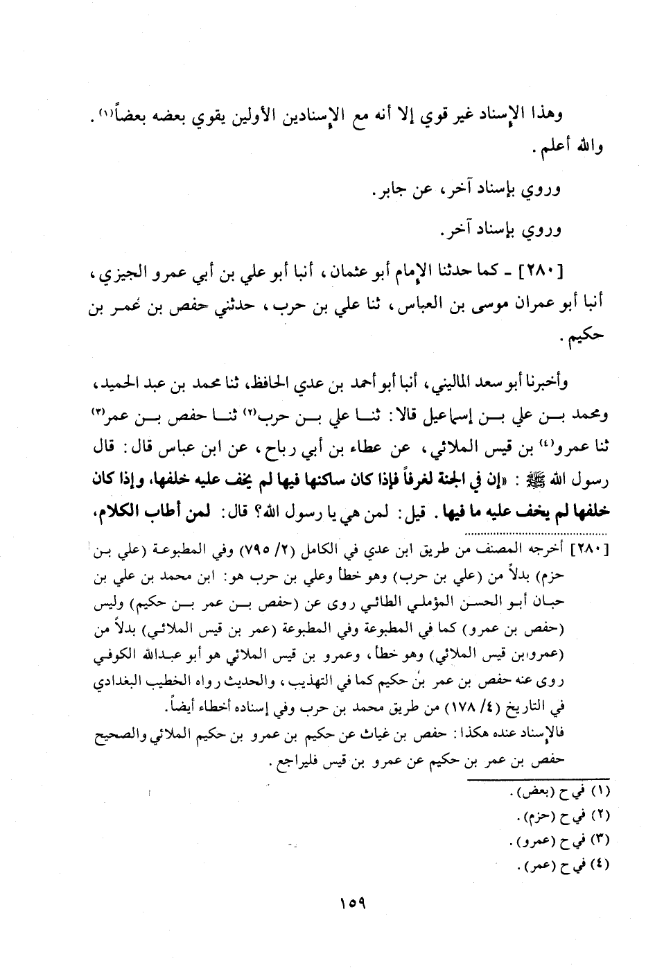 280 - (254) كَمَا حَدَّثَنَا الْإِمَامُ أَبُو عُثْمَانَ، أَنْبَأَ أَبُو عَلِيِّ بْنُ أَبِي عَمْرٍو الْجِيزِيُّ، أَنْبَأَ أَبُو عِمْرَانَ مُوسَى بْنُ الْعَبَّاسِ، ثنا عَلِيُّ بْنُ حَرْبٍ، حَدَّثَنِي حَفْصُ بْنُ عُمَرَ بْنِ حَكِيمٍ، وَأَخْبَرَنَا أَبُو سَعْدٍ الْمَالِينِيُّ، أَنْبَأَ أَبُو أَحْمَدَ بْنُ عَدِيٍّ الْحَافِظُ، ثنا مُحَمَّدُ بْنُ عَبْدِ الْحَمِيدِ، وَمُحَمَّدُ بْنُ عَلِيِّ بْنِ إِسْمَاعِيلَ، قَالَا: ثنا عَلِيُّ بْنُ حَرب، ثنا حَفْصُ بْنُ عمر، ثنا عَمْرُو بْنُ قَيْسٍ الْمُلَائِيُّ، عَنْ عَطَاءِ بْنِ أَبِي رَبَاحٍ، عَنِ ابْنِ عَبَّاسٍ، قَالَ: قَالَ رَسُولُ اللَّهِ صَلَّى اللهُ عَلَيْهِ وَسَلَّمَ: «إِنَّ فِي الْجَنَّةِ لَغُرَفًا فَإِذَا كَانَ سَاكِنُهَا فِيهَا لَمْ يَخْفُ عَلَيْهِ خَلْفُهَا، وَإِذَا كَانَ خَلْفَهَا لَمْ يَخْفُ عَلَيْهِ مَا فِيهَا»، قِيلَ: لِمَنْ هِيَ يَا رَسُولَ اللَّهِ؟ قَالَ: لِمَنْ أَطَابَ الْكَلَامَ، #160# وَوَاصِلَ الصِّيَامَ، وَأَطْعَمَ الطَّعَامَ، وَأَفْشَى السَّلَامَ، وَصَلَّى وَالنَّاسُ نِيَامٌ "، قِيلَ: وَمَا طَيِّبُ الْكَلَامِ؟ قَالَ: «سُبْحَانَ اللَّهِ، وَالْحَمْدُ لِلَّهِ، وَلَا إِلَهَ إِلَّا اللَّهُ، وَاللَّهُ أَكْبَرُ، وَلَا أَكْبَرُ إِلَّا اللَّهُ، فَإِنَّهَا تَاتِي يَوْمَ الْقِيَامَةِ، وَلَهَا مُقَدِّمَاتٌ، وَمُجَنَّبَاتٌ، وَمُعَقِّبَاتٌ»، قِيلَ: وَمَا وِصَالُ الصَّائِمِ؟ قَالَ: «مَنْ صَامَ شَهْرَ رَمَضَانَ ثُمَّ أَدْرَكَ شَهَرَ رَمَضَانَ فَصَامَهُ»، قِيلَ: وَمَا إِطْعَامُ الطَّعَامِ؟ قَالَ: «مَنْ قَاتَ عِيَالَهُ، وَأَطْعَمَهُمْ»، قِيلَ: فَمَا إِفْشَاءُ السَّلَامِ؟ قَالَ: «مُصَافَحَةُ أَخِيكَ، وَتَحِيَّتُهُ»، وَقِيلَ: وَمَا الصَّلَاةُ وَالنَّاسُ نِيَامٌ؟ قَالَ: «صَلَاةُ الْعِشَاءِ الْآخِرَةِ» لَفْظُ حَدِيثِ الْمَالِينِيِّ، وَحَفْصُ بْنُ عُمَرَ هَذَا مَجْهُولٌ لَمْ يَرْوِ عَنْهُ غَيْرُ عَلِيِّ بْنِ حَرْبٍ، وَاللَّهُ أَعْلَمُ