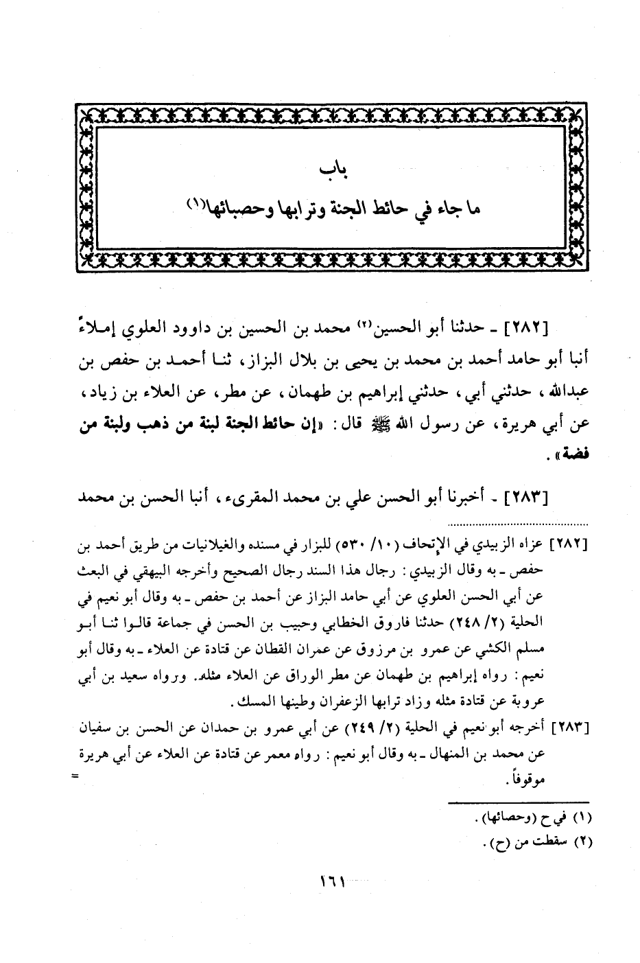 282 - (256) حَدَّثَنَا أبو الحسين محمد بْنُ الْحُسَيْنِ بْنِ دَاوُدَ الْعَلَوِيُّ إِمْلَاءً، أَنْبَأَ أَبُو حَامِدٍ أَحْمَدُ بْنُ مُحَمَّدِ بْنِ يَحْيَى بْنِ بِلَالٍ الْبَزَّازُ، ثنا أَحْمَدُ بْنُ حَفْصِ بْنِ عَبْدِ اللَّهِ، حَدَّثَنِي أَبِي، حَدَّثَنِي إِبْرَاهِيمُ بْنُ طَهْمَانَ، عَنْ مَطَرٍ، عَنِ الْعَلَاءِ بْنِ زِيَادٍ، عَنْ أَبِي هُرَيْرَةَ، عَنْ رَسُولِ اللَّهِ صَلَّى اللهُ عَلَيْهِ وَسَلَّمَ قَالَ: «إِنَّ حَائِطَ الْجَنَّةِ لَبِنَةٌ مِنْ ذَهَبٍ، وَلَبِنَةٌ مِنْ فِضَّةٍ»