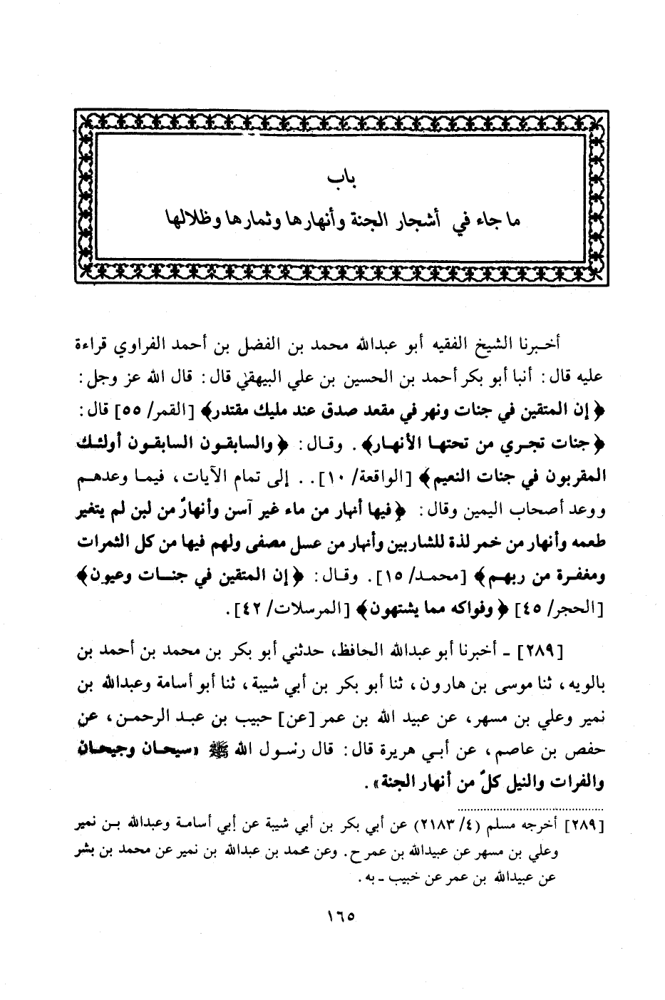 (262) أَخْبَرَنَا الشَّيْخُ الْفَقِيهِ أَبُو عَبْدِ اللَّهِ مُحَمَّدُ بْنُ الْفَضْلِ بْنِ أَحْمَدَ الْفَرَاوِيُّ قِرَاءَةً عَلَيْهِ قَالَ: أَنْبَأَ أَبُو بَكْرٍ أَحْمَدُ بْنُ الْحُسَيْنِ بْنِ عَلَيٍّ الْبَيْهَقِيُّ قال: قَالَ اللَّهُ عَزَّ وَجَلَّ: {إِنَّ الْمُتَّقِينَ فِي جَنَّاتٍ وَنَهَرٍ فِي مَقْعَدِ صِدْقٍ عِنْدَ مَلِيكٍ مُقْتَدِرٍ} "، قَالَ: {جَنَّاتٌ تَجْرِي مِنْ تَحْتِهَا الْأَنْهَارُ} "، وَقَالَ: {وَالسَّابِقُونَ السَّابِقُونَ أُولَئِكَ الْمُقَرَّبُونَ فِي جَنَّاتِ النَّعِيمِ} " إِلَى تَمَامِ الْآيَاتِ، فِيمَا وَعَدَّهُمْ وَوَعَدَ أَصْحَابَ الْيَمِينِ، وَقَالَ: {فِيهَا أَنْهَارٌ مِنْ مَاءٍ غَيْرِ آسِنٍ وَأَنْهَارٌ مِنْ لَبَنٍ لَمْ يَتَغَيَّرْ طَعْمُهُ وَأَنْهَارٌ مِنْ خَمْرٍ لَذَّةٍ لِلشَّارِبِينَ وَأَنْهَارٌ مِنْ عَسَلٍ مُصَفًّى وَلَهُمْ فِيهَا مِنْ كُلِّ الثَّمَرَاتِ وَمَغْفِرَةٌ مِنْ رَبِّهِمْ} "، وَقَالَ: {إِنَّ الْمُتَّقِينَ فِي جَنَّاتٍ وَعُيُونٍ} {وَفَوَاكِهَ مِمَّا يَشْتَهُونَ} "