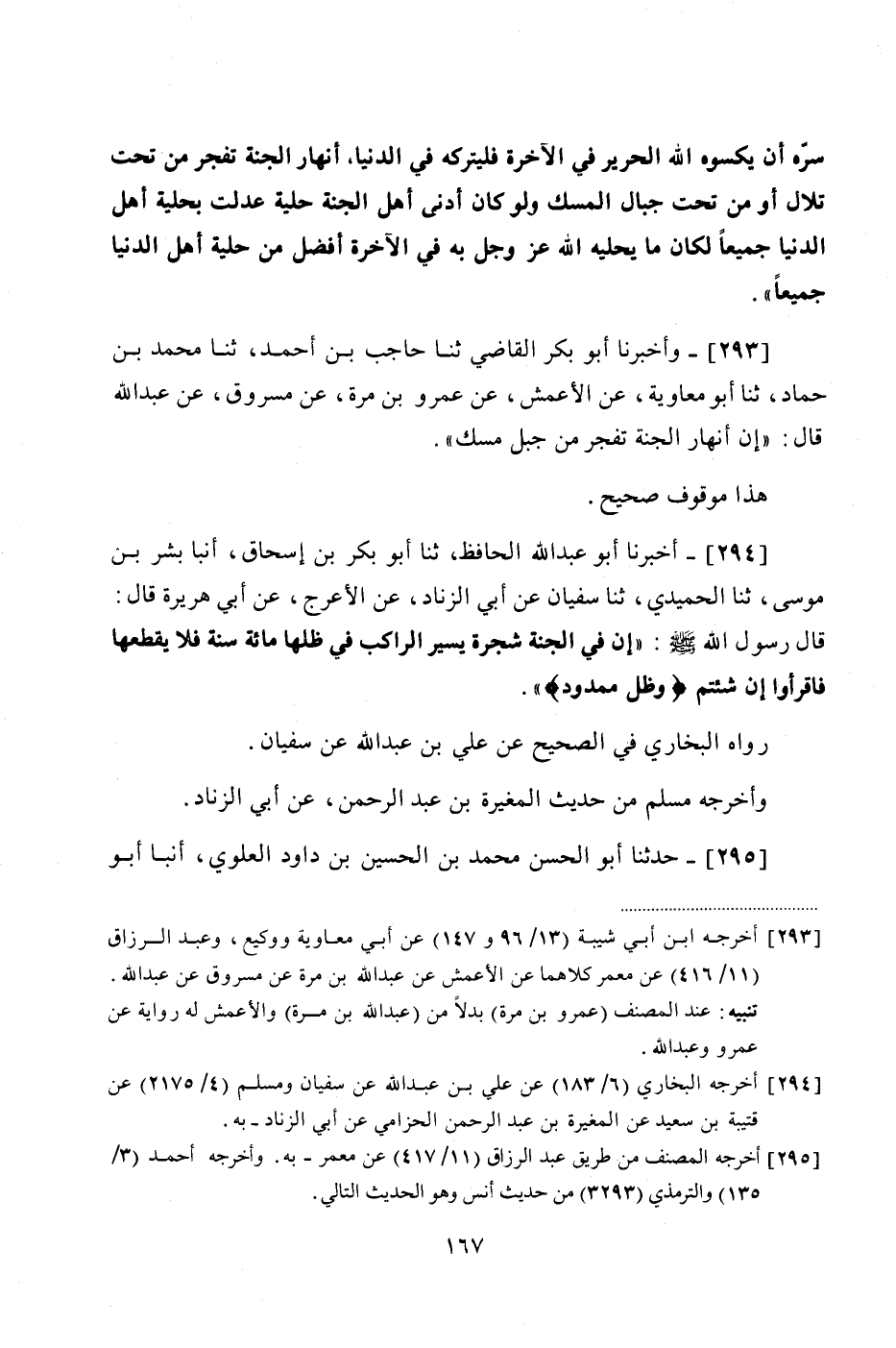 294 - (268) أَخْبَرَنَا أَبُو عَبْدِ اللَّهِ الْحَافِظُ، ثنا أَبُو بَكْرِ بْنُ إِسْحَاقَ، أَنْبَأَ بِشْرُ بْنُ مُوسَى، ثنا الْحُمَيْدِيُّ، ثنا سُفْيَانُ، عَنْ أَبِي الزِّنَادِ، عَنِ الْأَعْرَجِ، عَنْ أَبِي هُرَيْرَةَ، قَالَ: قَالَ رَسُولُ اللَّهِ صَلَّى اللهُ عَلَيْهِ وَسَلَّمَ: " إِنَّ فِي الْجَنَّةِ شَجَرَةً يَسِيرُ الرَّاكِبُ فِي ظِلِّهَا مِائَةَ سَنَةٍ، فَلَا يَقْطَعُهَا فَاقْرَأوا إِنْ شِئْتُمْ {وَظِلٍّ مَمْدُودٍ} "