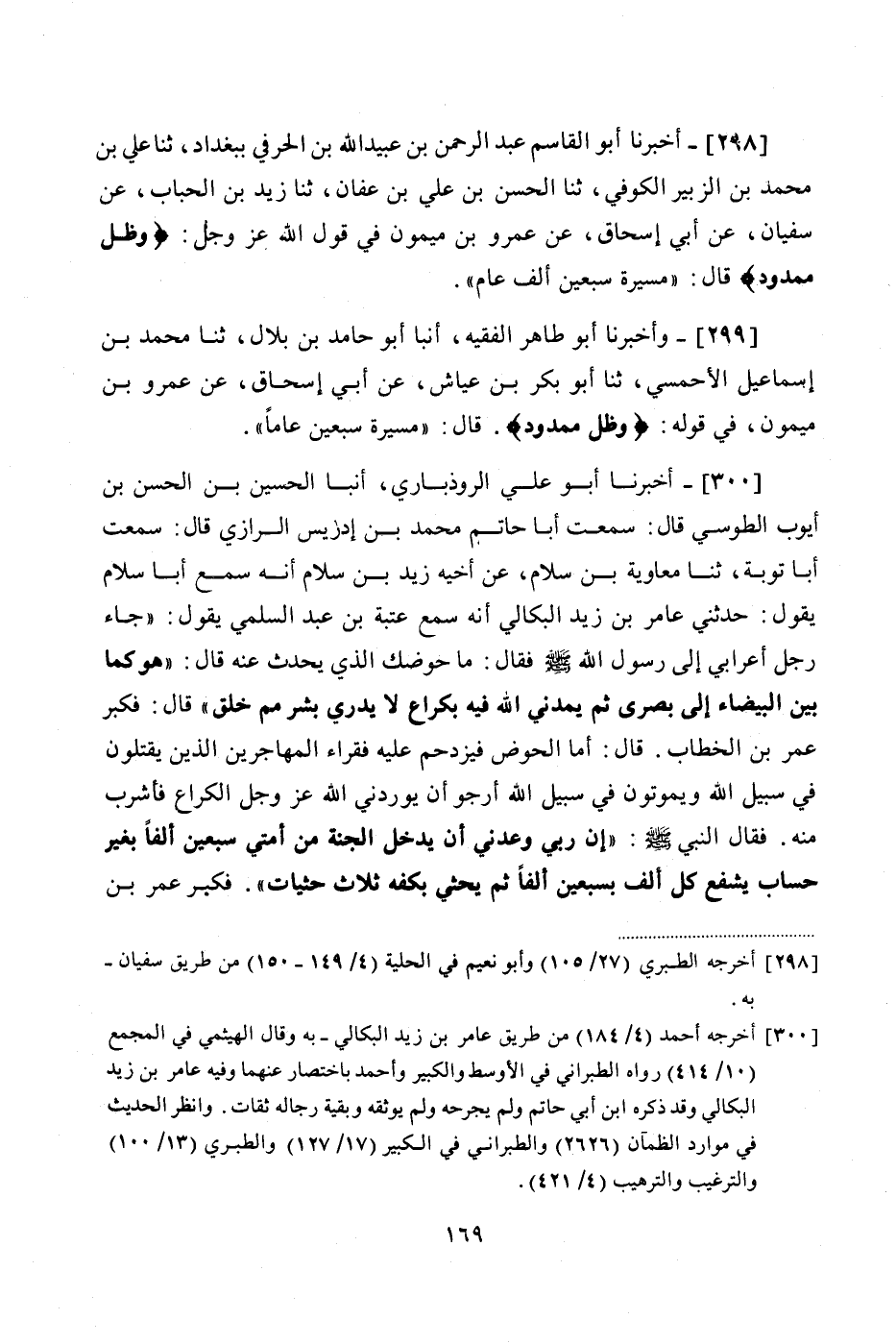 300 - (274) أَخْبَرَنَا أَبُو عَلِيٍّ الرُّوذْبَارِيُّ، أَنْبَأَ الْحُسَيْنُ بْنُ الْحَسَنِ بْنِ أَيُّوبَ الطُّوسِيُّ، قَالَ: سَمِعْتُ أَبَا حَاتِمٍ مُحَمَّدَ بْنَ إِدْرِيسَ الرَّازِيَّ قَالَ: سَمِعْتُ أَبَا تَوْبَةَ، ثنا مُعَاوِيَةُ بْنُ سَلَّامٍ، عَنْ أَخِيهِ، زَيْدِ بْنِ سَلَّامٍ، أَنَّهُ سَمِعَ أَبَا سَلَّامٍ، يَقُولُ: حَدَّثَنِي عَامِرُ بْنُ زَيْدٍ الْبِكَالِيُّ، أَنَّهُ سَمِعَ عُتْبَةَ بْنَ عَبْدِ السُّلَمِيِّ، يَقُولُ: جَاءَ رَجُلٌ أَعْرَابِيٌّ إِلَى رَسُولِ اللَّهِ صَلَّى اللهُ عَلَيْهِ وَسَلَّمَ فَقَالَ: مَا حَوْضُكَ الَّذِي يُحَدَّثُ عَنْهُ، قَالَ: «هُوَ كَمَا بَيْنَ الْبَيْضَاءِ إِلَى بُصْرَى، ثُمَّ يَمُدُّنِي اللَّهُ فِيهِ بِكُرَاعٍ لَا يَدْرِي بِشْرٌ مِمَّ خُلِقَ»، قَالَ: فَكَبَّرَ عُمَرُ بْنُ الْخَطَّابِ، قَالَ: أَمَّا الْحَوْضُ فَيَزْدَحِمُ عَلَيْهِ فُقَرَاءُ الْمُهَاجِرِينَ الَّذِينَ يُقْتَلُونَ فِي سَبِيلِ اللَّهِ وَيَمُوتُونَ فِي سَبِيلِ اللَّهِ أَرْجُو أَنْ يُورِدَنِيَ اللَّهُ عَزَّ وَجَلَّ الْكُرَاعَ، فَأَشْرَبُ مِنْهُ، فَقَالَ النَّبِيُّ صَلَّى اللهُ عَلَيْهِ وَسَلَّمَ: «إِنَّ رَبِّي وَعَدَنِي أَنْ يُدْخِلَ الْجَنَّةَ مِنْ أُمَّتِي سَبْعِينَ أَلْفًا بِغَيْرِ حِسَابٍ يُشَفِّعُ كُلَّ أَلْفٍ بِسَبْعِينَ أَلْفًا، ثُمَّ يَحْثِي بِكَفِّهِ ثَلَاثَ حَثَيَاتٍ»، فَكَبَّرَ عُمَرُ بْنُ #170# الْخَطَّابِ وَقَالَ: إِنَّ السَّبْعِينَ الْأَلْفَ الْأُولَييْنِ يُشَفِّعُهُمُ اللَّهُ فِي آبَائِهِمْ، وَأَبْنَائِهِمْ، وَعَشَائِرِهِمْ، أَرْجُو أَنْ يَجْعَلَنِيَ اللَّهُ فِي إِحْدَى الْحَثَيَاتِ الْأَوَاخِرِ، فَقَالَ الْأَعْرَابِيُّ: يَا رَسُولَ اللَّهِ فِيهَا فَاكِهَةٌ؟ قَالَ: «نَعَمْ، فِيهَا شَجَرٌ طُوبَى تُطَابِقُ الْفِرْدَوْسِ»، قَالَ: أَيُّ شَجَرَةِ أَرْضِنَا تُشْبِهُ؟ "، قَالَ: «لَيْسَ تُشْبِهُ شَيْئًا مِنْ شَجَرِ أَرْضِكَ»، وَلَكِنْ أَتَيْتَ الشَّامَ؟ قَالَ: لَا، قَالَ: «فَإِنَّهَا تُشْبِهُ شَجَرَةً بِالشَّامِ تُدْعَى الْحُورَةَ تَنْبُتُ عَلَى سَاقٍ وَاحِدٍ، ثُمَّ يَنْتَشِرُ أَعْلَاهَا»، قَالَ: مَا عَظْمُ أَصْلِهَا؟ قَالَ: «لَوِ ارْتَحَلَتْ جَذَعَةٌ مِنْ إِبِلِ أَهْلِكَ مَا أَحَطَّتْ بِأَصْلِهَا، حَتَّى تَنْكَسِرَ تَرْقُوَتَاهَا هَرَمًا»، قَالَ: فَهَلْ فِيهَا عِنَبٌ؟ قَالَ: «نَعَمْ»، قَالَ: مَا عِظَمُ الْعُنْقُودِ مِنْهُ؟ قَالَ: مَسِيرَةُ شَهْرٍ لِلْغُرَابِ لَا يَقَعُ وَلَا يَفْتُرُ، قَالَ: مَا عِظَمُ الْحَبَّةِ مِنْهُ؟ قَالَ: هَلْ ذَبَحَ أَبُوكَ تَيْسًا مِنْ غَنَمِهِ عَظِيمًا قَطُّ؟ قَالَ: نَعَمْ، قَالَ: فَسَلَخَ إِهَابَهُ فَأَعْطَاهُ أُمَّكَ فَقَالَ ادْبِغِي هَذَا، ثُمَّ أَفْرَى لَنَا مِنْهُ دَلْوًا نَرْوِي بِهِ مَاشِيَتَنَا، قَالَ: فَإِنَّ تِلْكَ الْحَبَّةَ تُشْبِعُنِي، وَأَهْلَ بَيْتِي؟ قَالَ: نَعَمْ، وَعَامَّةَ عَشِيرَتِكَ "