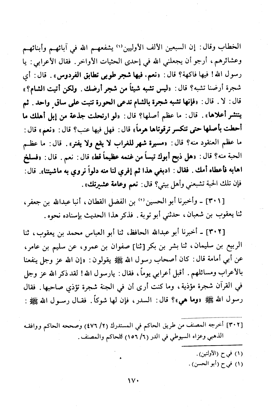 302 - (276) أَخْبَرَنَا أَبُو عَبْدِ اللَّهِ الْحَافِظُ، ثنا أَبُو الْعَبَّاسِ مُحَمَّدُ بْنُ يَعْقُوبَ ثنا الرَّبِيعُ بْنُ سُلَيْمَانَ، ثنا بِشْرُ بْنُ بَكْرٍ، ثنا صَفْوَانُ بْنُ عَمْرٍو، عَنْ سُلَيْمِ بْنِ عَامِرٍ، عَنْ أَبِي أُمَامَةَ، قَالَ: كَانَ أَصْحَابُ رَسُولِ اللَّهِ صَلَّى اللهُ عَلَيْهِ وَسَلَّمَ يَقُولُونَ: إِنَّ اللَّهَ عَزَّ وَجَلَّ يَنْفَعُنَا بِالْأَعْرَابِ، وَمَسَائِلِهِمْ، أَقْبَلَ أَعْرَابِيٌّ يَوْمًا، فَقَالَ: يَا رَسُولَ اللَّهِ لَقَدْ ذَكَرَ اللَّهُ عَزَّ وَجَلَّ فِي الْقُرْآنِ شَجَرَةً مُؤْذِيَةً، وَمَا كُنْتُ أَرَى أَنَّ فِي الْجَنَّةِ شَجَرَةً تُؤْذِي صَاحِبَهَا، فَقَالَ رَسُولُ اللَّهِ صَلَّى اللهُ عَلَيْهِ وَسَلَّمَ: «وَمَا هِيَ؟» قَالَ: السِّدْرُ، فَإِنَّ لَهَا شَوْكًا، فَقَالَ رَسُولُ اللَّهِ صَلَّى اللهُ عَلَيْهِ وَسَلَّمَ:" #171# يَقُولُ اللَّهُ عَزَّ وَجَلَّ: {فِي سِدْرٍ مَخْضُودٍ} «يَخْضُدُ اللَّهُ شَوْكَهُ، فَيُجْعَلُ مَكَانَ شَوْكِهِ ثَمَرًا، إِنَّهَا تَنْبُتُ، ثُمَّ انْفَتَقَ الثَّمَرُ مِنْهَا عَنِ اثْنَيْنِ وَسَبْعُونَ لَوْنًا مِنْ طَعَامٍ مَا مِنْهَا لَوْنٌ يُشْبِهُ الْآخَرَ»
