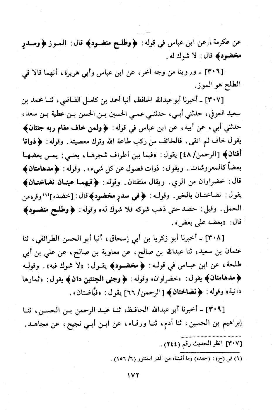 307 - (280) أَخْبَرَنَا أَبُو عَبْدِ اللَّهِ الْحَافِظُ، أَنْبَأَ أَحْمَدُ بْنُ كَامِلٍ الْقَاضِي، ثنا مُحَمَّدُ بْنُ سَعِيدٍ الْعُوفِيُّ، حَدَّثَنِي أَبِي، حَدَّثَنِي عَمِّي الْحُسَيْنُ بْنُ الْحَسَنِ بْنِ عَطِيَّةَ بْنِ سَعْدٍ، حَدَّثَنِي أَبِي، عَنْ أَبِيهِ، عَنِ ابْنِ عَبَّاسٍ، فِي قَوْلِهِ: {وَلِمَنْ خَافَ مَقَامَ رَبِّهِ جَنَّتَانِ} "، يَقُولُ: خَافَ ثُمَّ اتَّقَى، فَالْخَائِفُ مَنْ رَكِبَ طَاعَةَ اللَّهِ، وَتَرَكَ مَعْصِيَتَهُ، وَقَوْلُهُ: {ذَوَاتَا أَفْنَانٍ} "، يَقُولُ: " فِيمَا بَيْنَ أَطْرَافِ شَجَرِهَا، يَعْنِي: يَمَسُّ بَعْضُهَا بَعْضًا كَالْمَعْرُوشَاتِ، وَيَقُولُ: ذَوَاتُ فُصُولٍ عَنْ كُلِّ شَيْءٍ "، وَقَوْلُهُ: {مُدْهَامَّتَانِ} "، قَالَ: " خَضْرَاوَانِ مِنَ الرِّيِّ، وَيُقَالُ: مُلْتَفَّتَانِ، وَقَوْلُهُ: {فِيهِمَا عَيْنَانِ نَضَّاخَتَانِ} "، يَقُولُ: نَضَّاخَتَانِ بِالْخَيْرِ، وَقَوْلُهُ: {فِي سِدْرٍ مَخْضُودٍ} "، قَالَ: خضده، وَقَرَّهُ مِنَ الْحَمْلِ، وَقِيلَ: حُصِدَ حَتَّى ذَهَبَ شَوْكُهُ فَلَا شَوْكَ لَهُ "، وَقَوْلُهُ: {وَطَلْحٍ مَنْضُودٍ} "، قَالَ: بَعْضُهُ عَلَى بَعْضٍ "