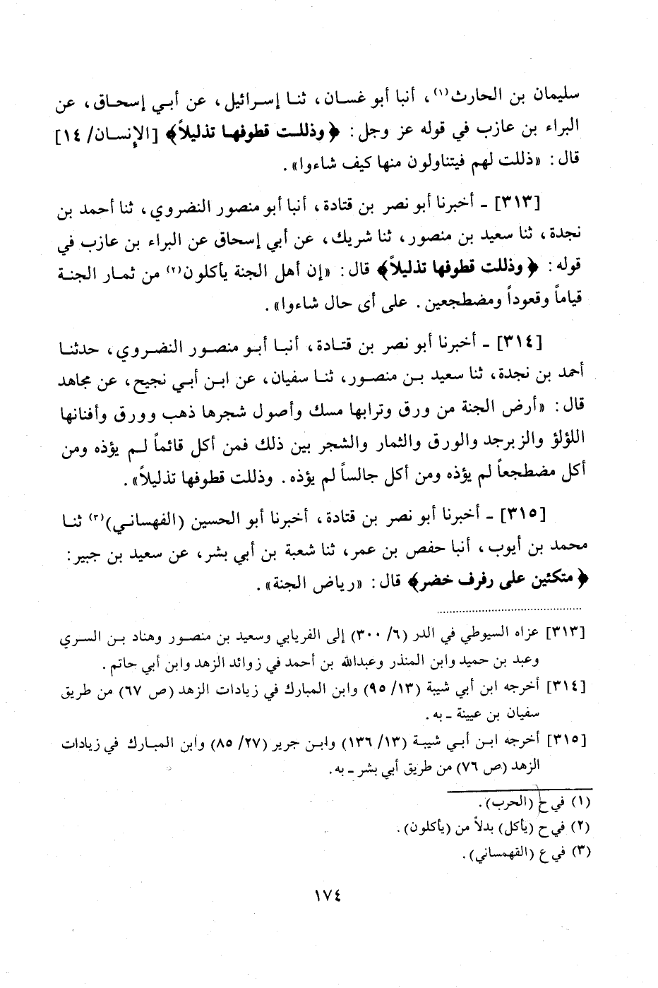 313 - (285) أَخْبَرَنَا أَبُو نصْرِ بْنُ قَتَادَةَ، أَنْبَأَ أَبُو مَنْصُورٍ النَّضْرَوِيُّ، ثنا أَحْمَدُ بْنُ نَجْدَةَ، ثنا سَعِيدُ بْنُ مَنْصُورٍ، ثنا شَرِيكٌ، عَنْ أَبِي إِسْحَاقَ، عَنِ الْبَرَاءِ بْنِ عَازِبٍ، فِي قَوْلِهِ: {وَذُلِّلَتْ قُطُوفُهَا تَذْلِيلًا}، قَالَ: «إِنَّ أَهْلَ الْجَنَّةِ يَاكُلُون مِنْ ثِمَارِ الْجَنَّةِ قِيَامًا، وَقُعُودًا، وَمُضْطَجِعِينَ، عَلَى أَيِّ حَالٍ شَاءُوا»