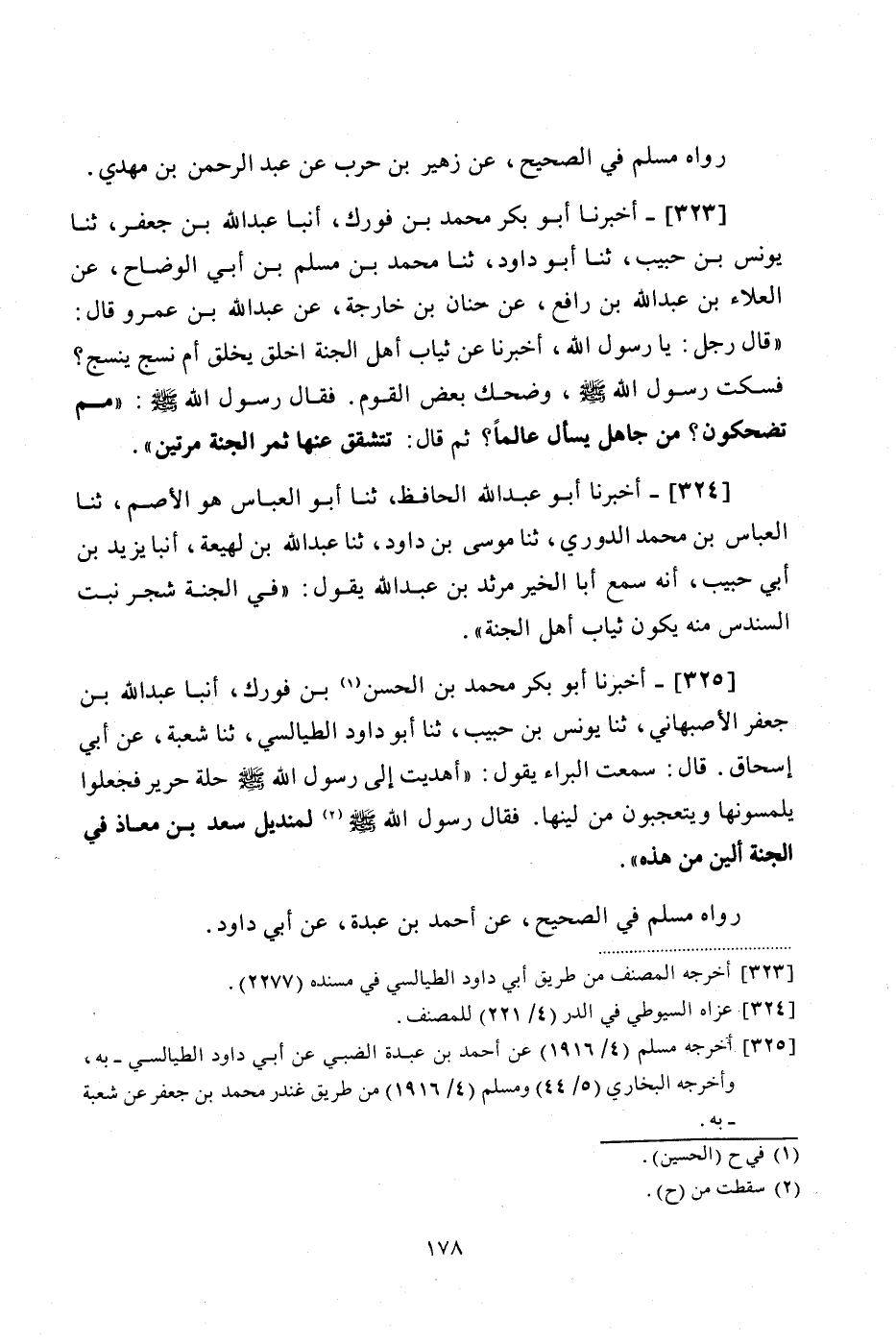 325 - (297) أَخْبَرَنَا أَبُو بَكْرٍ مُحَمَّدُ بْنُ الْحسَنِ بْنِ فُورَكٍ، أَنْبَأَ عَبْدُ اللَّهِ بْنُ جَعْفَرٍ الْأَصْبَهَانِيُّ، ثنا يُونُسُ بْنُ حَبِيبٍ، ثنا أَبُو دَاوُدَ الطَّيَالِسِيُّ، ثنا شُعْبَةُ، عَنْ أَبِي إِسْحَاقَ، قَالَ: سَمِعْتُ الْبَرَاءَ، يَقُولُ: أُهْدِيَتْ إِلَى رَسُولِ اللَّهِ صَلَّى اللهُ عَلَيْهِ وَسَلَّمَ حُلَّةُ حَرِيرٍ فَجَعَلُوا يَلْمِسُونَهَا، وَيَتَعَجَّبُونَ مِنْ لِينِهَا، فَقَالَ رَسُولُ اللَّهِ لَمَنْدِيلُ سَعْدِ بْنِ مُعَاذٍ فِي الْجَنَّةِ أَلْيَنُ مِنْ هَذِهِ "