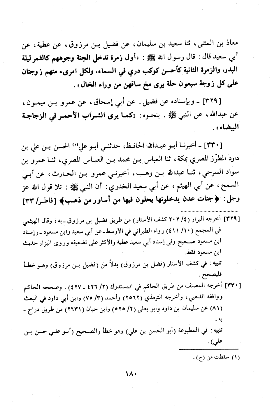 330 - (301) أَخْبَرَنَا أَبُو عَبْدِ اللَّهِ الْحَافِظُ، حَدَّثَنِي أَبُو علي الْحَسَنِ بْنُ عَلِيِّ بْنِ دَاوُدَ الْمُطَرِّزُ الْمِصْريَّ، بِمَكَّةَ، ثنا الْعَبَّاسُ بْنُ مُحَمَّدِ بْنِ الْعَبَّاسِ الْمِصْرِيُّ، ثنا عَمْرُو بْنُ سَوَّادٍ السَّرْحِيُّ، ثنا عَبْدُ اللَّهِ بْنُ وَهْبٍ، أَخْبَرَنِي عَمْرُو بْنُ الْحَارِثِ، عَنْ أَبِي السَّمْحِ، عَنْ أَبِي الْهَيْثَمِ، عَنْ أَبِي سَعِيدٍ الْخُدْرِيِّ، " أَنَّ النَّبِيَّ صَلَّى اللهُ عَلَيْهِ وَسَلَّمَ: تَلَا قَوْلَ اللَّهِ عَزَّ وَجَلَّ: {جَنَّاتُ عَدْنٍ يَدْخُلُونَهَا يُحَلَّوْنَ فِيهَا مِنْ أَسَاوِرَ مِنْ ذَهَبٍ} " #181#، فَقَالَ: إِنَّ عَلَيْهِمُ التِّيجَانَ، إِنَّ أَدْنَى لُؤْلُؤَةٍ فِيهَا لَتُضِيءُ مَا بَيْنَ الْمَشْرِقِ، وَالْمَغْرِبِ"