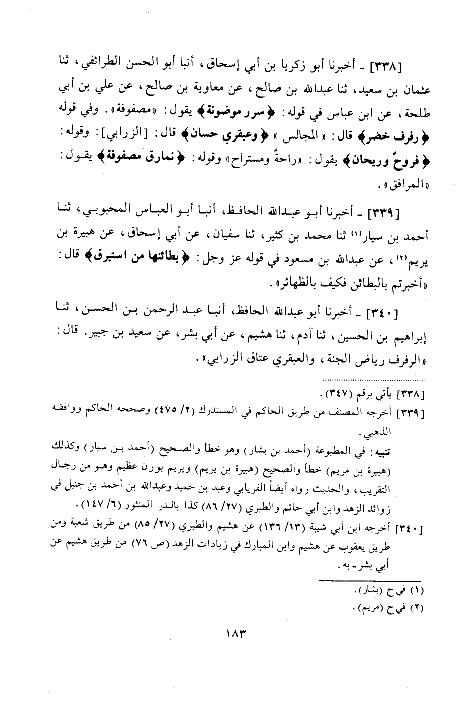 340 - (310) أَخْبَرَنَا أَبُو عَبْدِ اللَّهِ الْحَافِظُ، أَنْبَأَ عَبْدُ الرَّحْمَنِ بْنُ الْحَسَنِ، ثنا إِبْرَاهِيمُ بْنُ الْحُسَيْنِ، ثنا آدَمُ، ثنا هُشَيْمٌ، عَنْ أَبِي بِشْرٍ، عَنْ سَعِيدِ بْنِ جُبَيْرٍ، قَالَ: «الرَّفْرَفُ رِيَاضُ الْجَنَّةِ، وَالْعَبْقَرِيُّ عَتَاقُ الزَّرَابِيِّ»