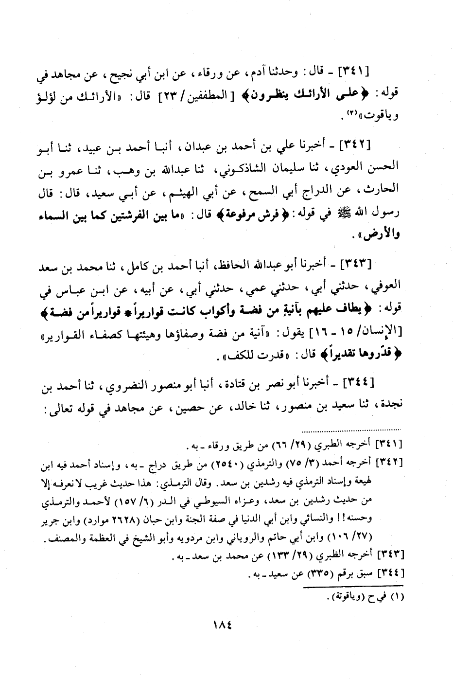 344 - (313) أَخْبَرَنَا أَبُو نَصْرِ بْنُ قَتَادَةَ، أَنْبَأَ أَبُو مَنْصُورٍ النَّضْرَوِيُّ، ثنا أَحْمَدُ بْنُ نَجْدَةَ، ثنا سَعِيدُ بْنُ مَنْصُورٍ، ثنا خَالِدٌ، عَنْ حُصَيْنٍ، عَنْ مُجَاهِدٍ، فِي قَوْلِهِ تَعَالَى: #185# {مُتَّكِئِينَ فِيهَا عَلَى الْأَرَائِكِ} "، قَالَ: «هِيَ الْأَسِرَّةُ فِي الْحِجَالِ»