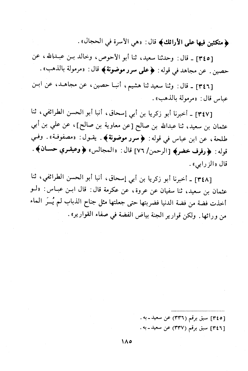 345 - قَالَ: وَحَدَّثنا سَعِيدٌ، ثنا أَبُو الْأَحْوَصِ، وَخَالِدُ بْنُ عَبْدِ اللَّهِ، عَنْ حُصَيْنٍ، عَنْ مُجَاهِدٍ فِي قَوْلِهِ: {عَلَى سُرَرٍ مَوْضُونَةٍ} "، قَالَ: «مَرْمُولَةٍ بِالذَّهَبِ»