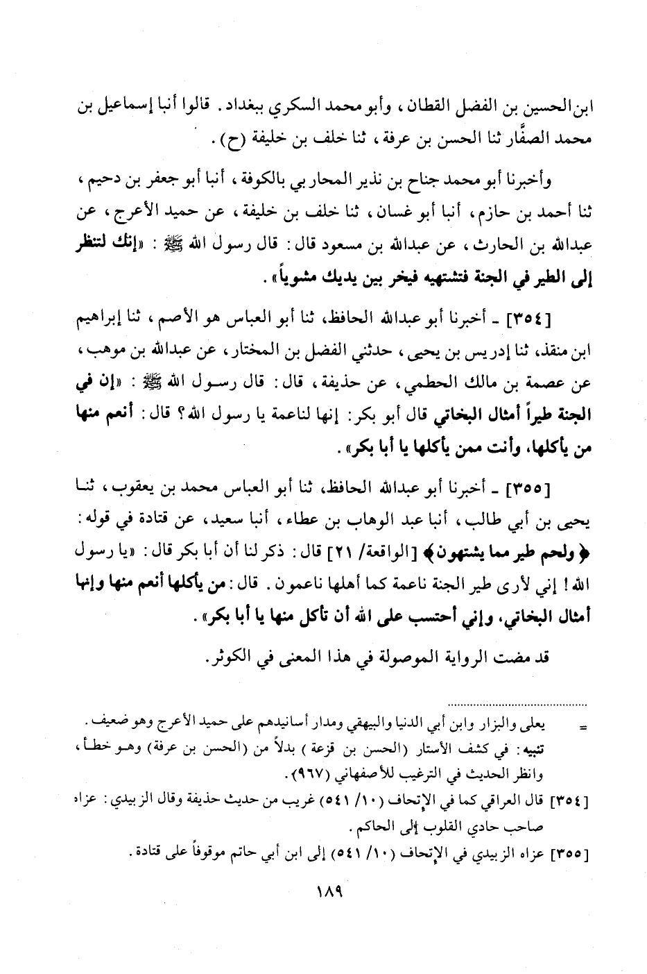 355 - (320) أَخْبَرَنَا أَبُو عَبْدِ اللَّهِ الْحَافِظُ، ثنا أَبُو الْعَبَّاسِ مُحَمَّدُ بْنُ يَعْقُوبَ، ثنا يَحْيَى بْنُ أَبِي طَالِبٍ، أَنْبَأَ عَبْدُ الْوَهَّابِ بْنُ عَطَاءٍ، أَنْبَأَ سَعِيدٌ، عَنْ قَتَادَةَ، فِي قَوْلِهِ: {وَلَحْمِ طَيْرٍ مِمَّا يَشْتَهُونَ} قَالَ: ذُكِرَ لَنَا أَنَّ أَبَا بَكْرٍ قَالَ: " يَا رَسُولَ اللَّهِ، إِنِّي لَأَرَى طَيْرَ الْجَنَّةِ نَاعِمَةً كَمَا أَهْلُهَا نَاعِمُونَ. قَالَ: «مَنْ يَاكُلُهَا أَنْعَمُ مِنْهَا، وَإِنَّهَا أَمْثَالُ الْبَخَاتِيِّ، وَإِنِّي أَحْتَسِبُ عَلَى اللَّهِ أَنْ تَاكُلَ مِنْهَا يَا أَبَا بَكْرٍ» قَدْ مَضَتِ الرِّوَايَةُ الْمَوْصُولَةُ فِي هَذَا الْمَعْنَى فِي الْكَوْثَرِ