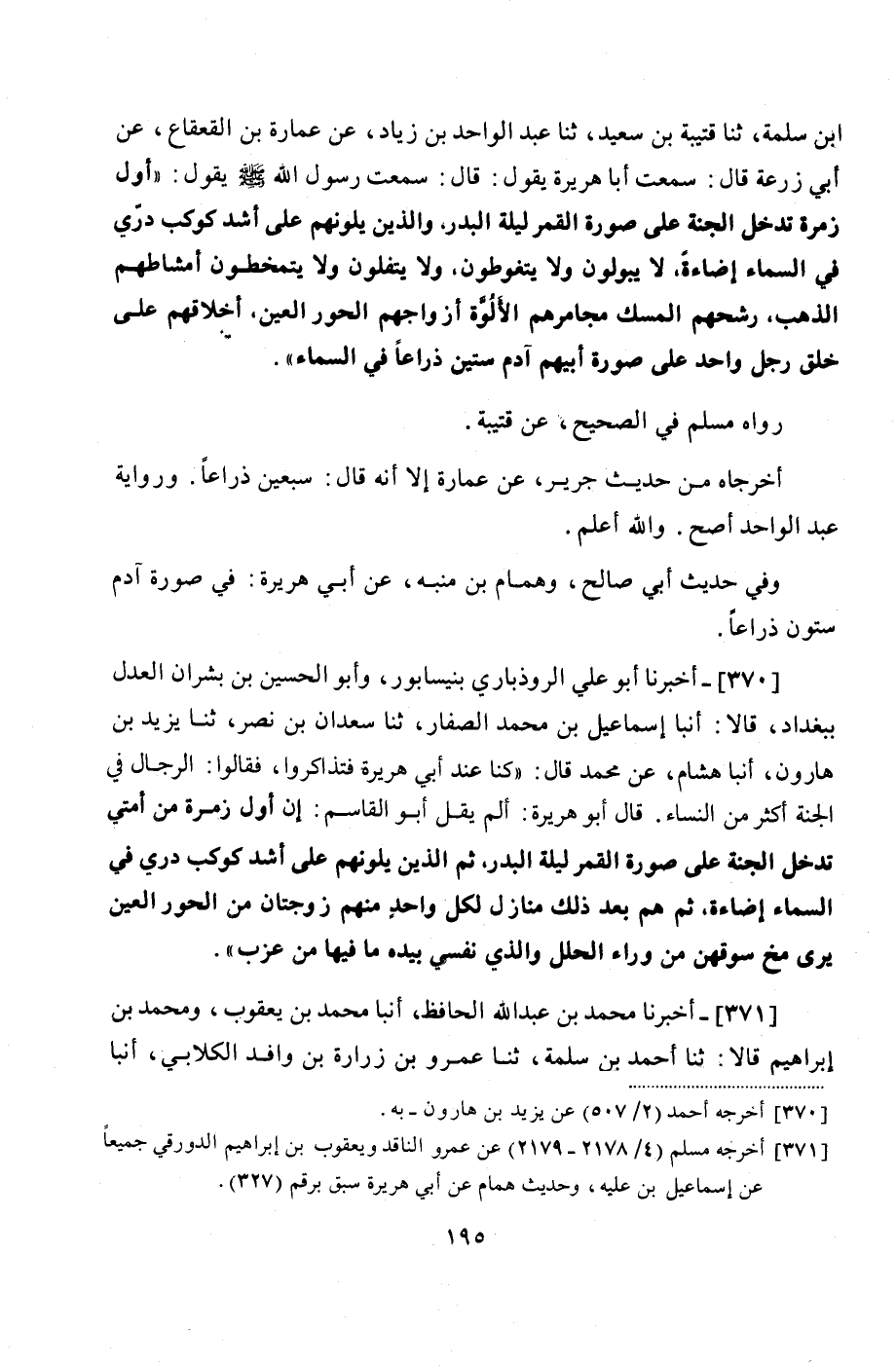 رَوَاهُ مُسْلِمٌ فِي الصَّحِيحِ، عَنْ يَعْقُوبَ بْنِ إِبْرَاهِيمَ، وَغَيْرُهُ عَنْ إِسْمَاعِيلَ ابْنِ عُلَيَّةَ، وَأَخْرَجَاهُ مِنْ حَدِيثِ هَمَّامِ بْنِ مُنَبِّهٍ، عَنْ أَبِي هُرَيْرَةَ. زَادَ: «يُرَى مُخُّ سُوقِهِمْ مِنْ وَرَاءِ اللَّحْمِ، مِنَ الْحُسْنِ»