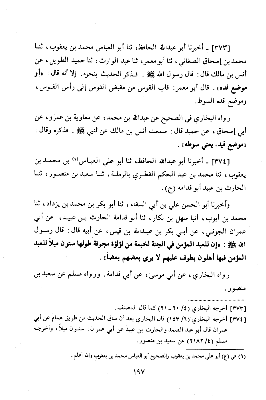 373 - (337) أَخْبَرَنَا أَبُو عَبْدِ اللَّهِ الْحَافِظُ، ثنا أَبُو الْعَبَّاسِ مُحَمَّدُ بْنُ يَعْقُوبَ، ثنا مُحَمَّدُ بْنُ إِسْحَاقَ الصَّغَانِيُّ، ثنا أَبُو مَعْمَرٍ، ثنا عَبْدُ الْوَارِثِ، ثنا حُمَيْدٌ الطَّوِيلُ، عَنْ أَنَسِ بْنِ مَالِكٍ، قَالَ: قَالَ رَسُولُ اللَّهِ صَلَّى اللهُ عَلَيْهِ وَسَلَّمَ. فَذَكَرَ الْحَدِيثَ بِنَحْوِهِ، إِلَّا أَنَّهُ قَالَ: «أَوْ مَوْضِعُ قَدِّهِ» قَالَ أَبُو مَعْمَرٍ: قَابُ الْقَوْسِ مِنْ مَقْبَضِ الْقَوْسِ إِلَى رَاسِ الْقَوْسِ، وَمَوْضِعُ قَدِّهِ السَّوْطِ