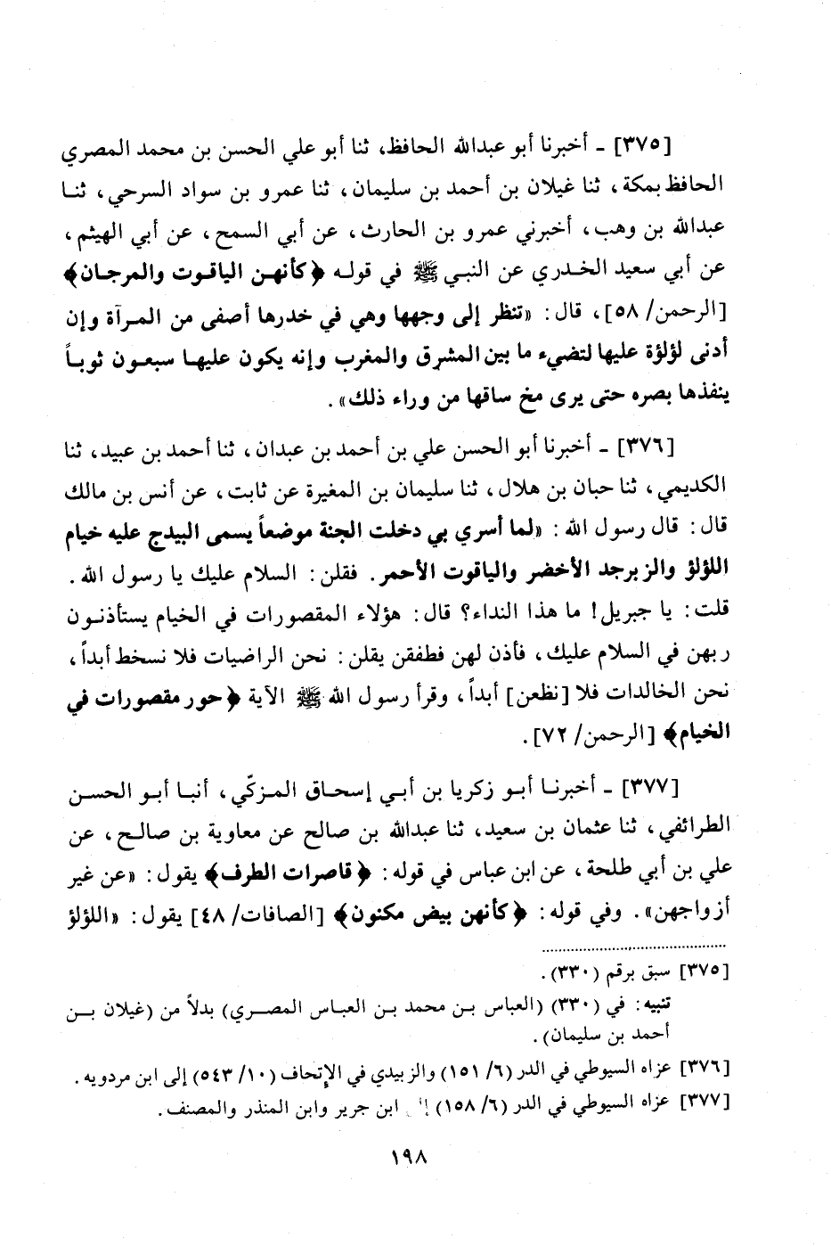 375 - (339) أَخْبَرَنَا أَبُو عَبْدِ اللَّهِ الْحَافِظُ، ثنا أَبُو عَلِيٍّ الْحَسَنُ بْنُ مُحَمَّدٍ الْمِصْرِيُّ الْحَافِظُ، بِمَكَّةَ، ثنا غَيْلَانُ بْنُ أَحْمَدَ بْنِ سُلَيْمَانَ، ثنا عَمْرُو بْنُ سَوَّادٍ السَّرْحِيُّ، ثنا عَبْدُ اللَّهِ بْنُ وَهْبٍ، أَخْبَرَنِي عَمْرُو بْنُ الْحَارِثِ، عَنْ أَبِي السَّمْحِ، عَنْ أَبِي الْهَيْثَمِ، عَنْ أَبِي سَعِيدٍ الْخُدْرِيِّ، عَنِ النَّبِيِّ صَلَّى اللهُ عَلَيْهِ وَسَلَّمَ فِي قَوْلِهِ: {كَأَنَّهُنَّ الْيَاقُوتُ وَالْمَرْجَانُ}، قَالَ: «تَنْظُرُ إِلَى وَجْهِهَا وَهِيَ فِي خِدْرِهَا أَصْفَى مِنَ الْمِرْآةِ، وَإِنَّ أَدْنَى لُؤْلُؤَةٍ عَلَيْهَا لَتُضِيءُ مَا بَيْنَ الْمَشْرِقِ، وَالْمَغْرِبِ، وَأَنَّهُ يَكُونُ عَلَيْهَا سَبْعُونَ ثَوْبًا يَنْفُذُهَا بَصَرُهُ، حَتَّى يَرَى مُخَّ سَاقِهَا مِنْ وَرَاءِ ذَلِكَ»