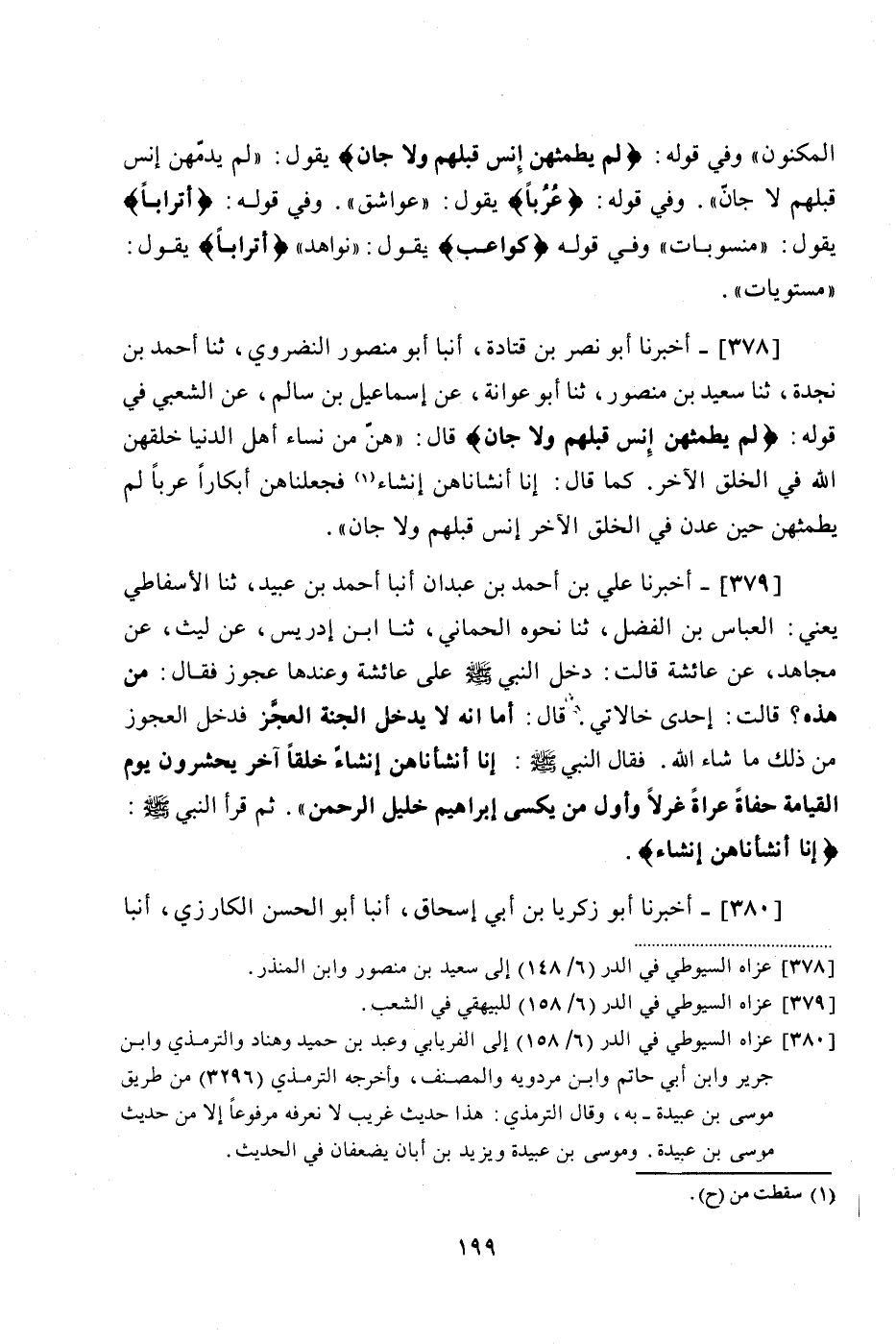 378 - (342) أَخْبَرَنَا أَبُو نَصْرِ بْنُ قَتَادَةَ، أَنْبَأَ أَبُو مَنْصُورٍ النَّضْرَوِيُّ، ثنا أَحْمَدُ بْنُ نَجْدَةَ، ثنا سَعِيدُ بْنُ مَنْصُورٍ، ثنا أَبُو عَوَانَةَ، عَنْ إِسْمَاعِيلَ بْنِ سَالِمٍ، عَنِ الشَّعْبِيِّ، فِي قَوْلِهِ: {لَمْ يَطْمِثْهُنَّ إِنْسٌ قَبْلَهُمْ وَلَا جَانٌّ}، قَالَ: «هُنَّ مِنْ نِسَاءِ أَهْلِ الدُّنْيَا خَلَقَهُنَّ اللَّهُ فِي الْخَلْقِ الْآخَرِ»، كَمَا قَالَ: إِنَّا أَنْشَانَاهُنَّ إنشاء فَجَعَلْنَاهُنَّ أَبْكَارًا عُرُبًا لَمْ يَطْمِثْهُنَّ حِينَ عُدْنَ فِي الْخَلْقِ الْآخَرِ إِنْسٌ قَبْلَهُمْ وَلَا جَانٌّ "