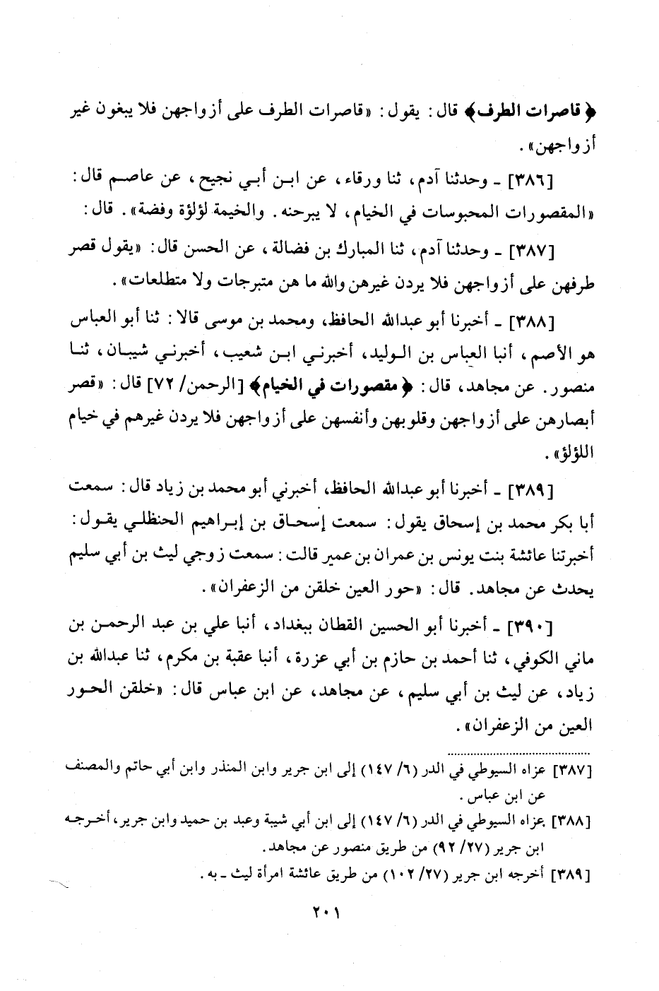 388 - (352) أَخْبَرَنَا أَبُو عَبْدِ اللَّهِ الْحَافِظُ، وَمُحَمَّدُ بْنُ مُوسَى، قَالَا: ثنا أَبُو الْعَبَّاسِ هُوَ الْأَصَمُّ، أَنْبَأَ الْعَبَّاسُ بْنُ الْوَلِيدِ، أَخْبَرَنِي ابْنُ شُعَيْبٍ، أَخْبَرَنِي شَيْبَانُ، ثنا مَنْصُورٌ، عَنْ مُجَاهِدٍ، قَالَ: {مَقْصُورَاتٌ فِي الْخِيَامِ}، قَالَ: «قَصَرَ أَبْصَارَهُنَّ عَلَى أَزْوَاجِهِنَّ، وَقُلُوبَهُنَّ، وَأَنْفُسَهُنَّ عَلَى أَزْوَاجِهِنَّ، فَلَا يُرِدْنَ غَيْرَهُمْ فِي خِيَامِ اللُّؤْلُؤِ»