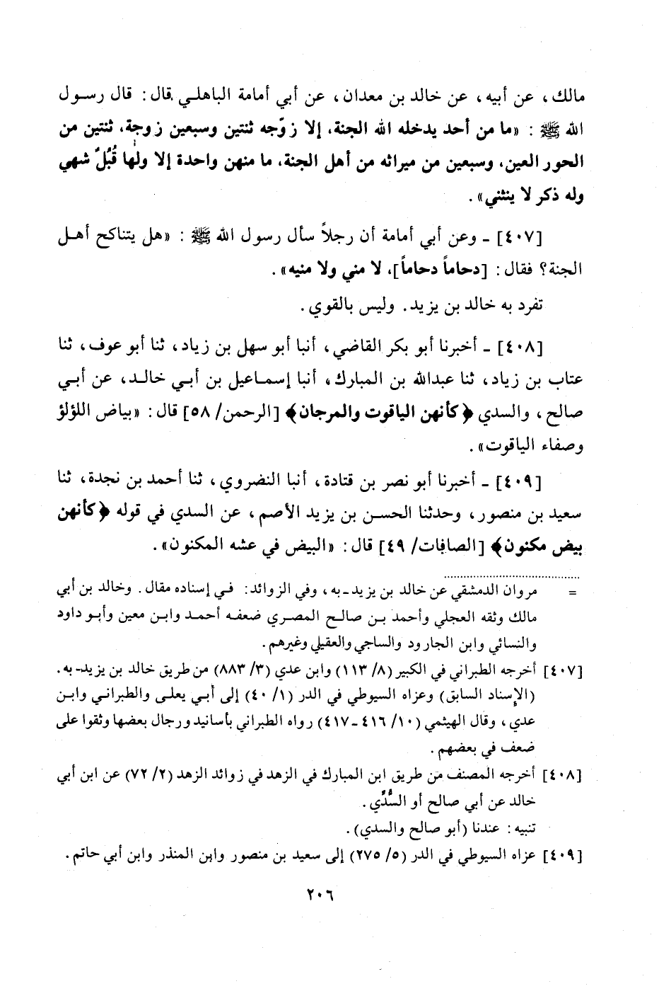 407 - وَعَنْ أَبِي أُمَامَةَ أَنَّ رَجُلًا سَأَلَ رَسُولَ اللَّهِ صَلَّى اللهُ عَلَيْهِ وَسَلَّمَ: هَلْ يَتَنَاكَحُ أَهْلُ الْجَنَّةِ؟ فَقَالَ: «دِحَامًا دِحَامًا، لَا مَنِيَّ وَلَا منيه» تَفَرَّدَ بِهِ خَالِدُ بْنُ يَزِيدَ، وَلَيْسَ بِالْقَوِيِّ