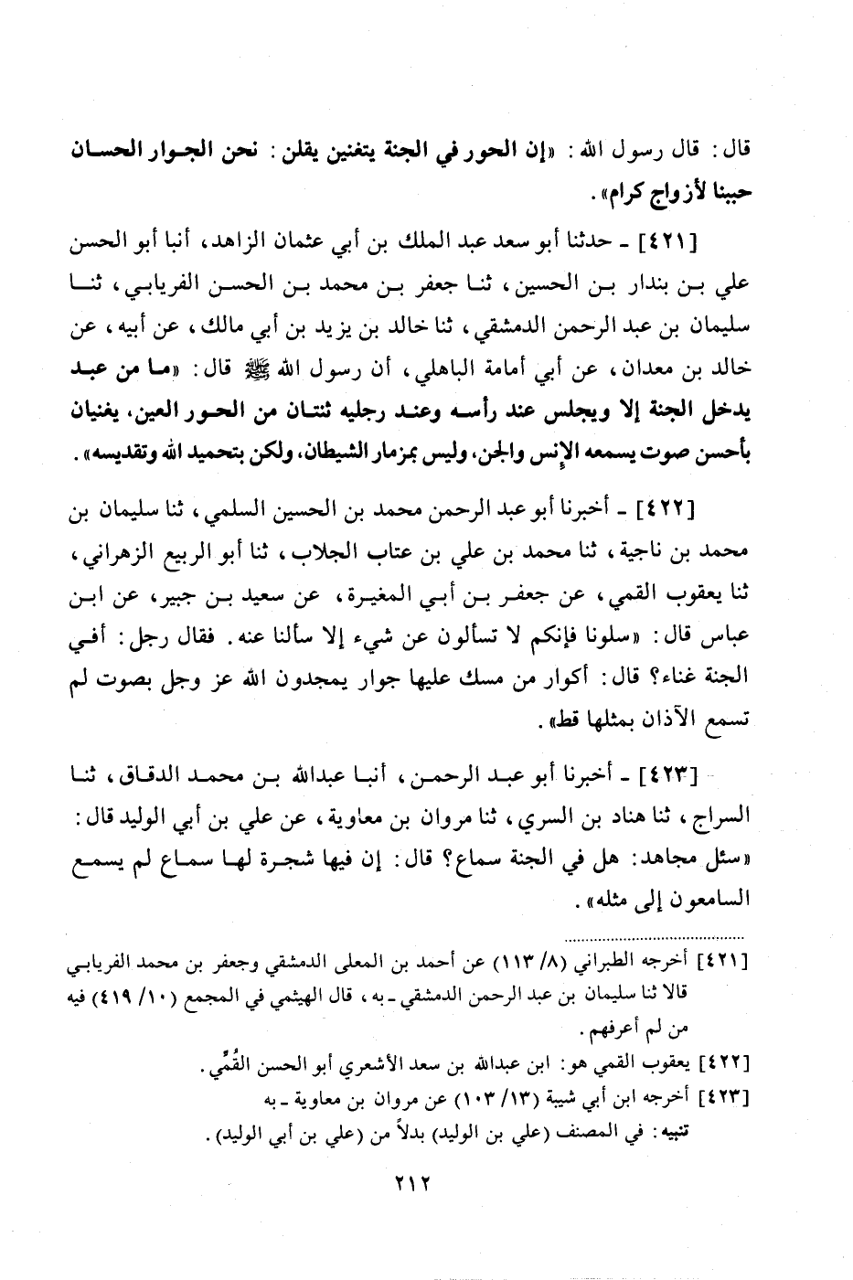 423 - (381) أَخْبَرَنَا أَبُو عَبْدِ الرَّحْمَنِ، أَنْبَأَ عَبْدُ اللَّهِ بْنُ مُحَمَّدٍ الدَّقَّاقُ، ثنا السَّرَّاجُ، ثنا هَنَّادُ بْنُ السَّرِيِّ، ثنا مَرْوَانُ بْنُ مُعَاوِيَةَ، عَنْ عَلِيِّ بْنِ أَبِي الْوَلِيدِ، قَالَ: " سُئِلَ مُجَاهِدٌ: هَلْ فِي الْجَنَّةِ سَمَاعٌ؟ قَالَ: «إِنَّ فِيهَا شَجَرَةً لَهَا سَمَاعٌ لَمْ يَسْمَعِ السَّامِعُونُ إِلَى مِثْلِهِ» #213# وَقَدْ رُوِيَ فِيهِ أَحَادِيثُ مَرْفُوعَةٌ أَسَانِيدُهَا ضَعِيفَةٌ بِمَرَّةٍ، فَتَرَكْتُ نَقْلَهَا