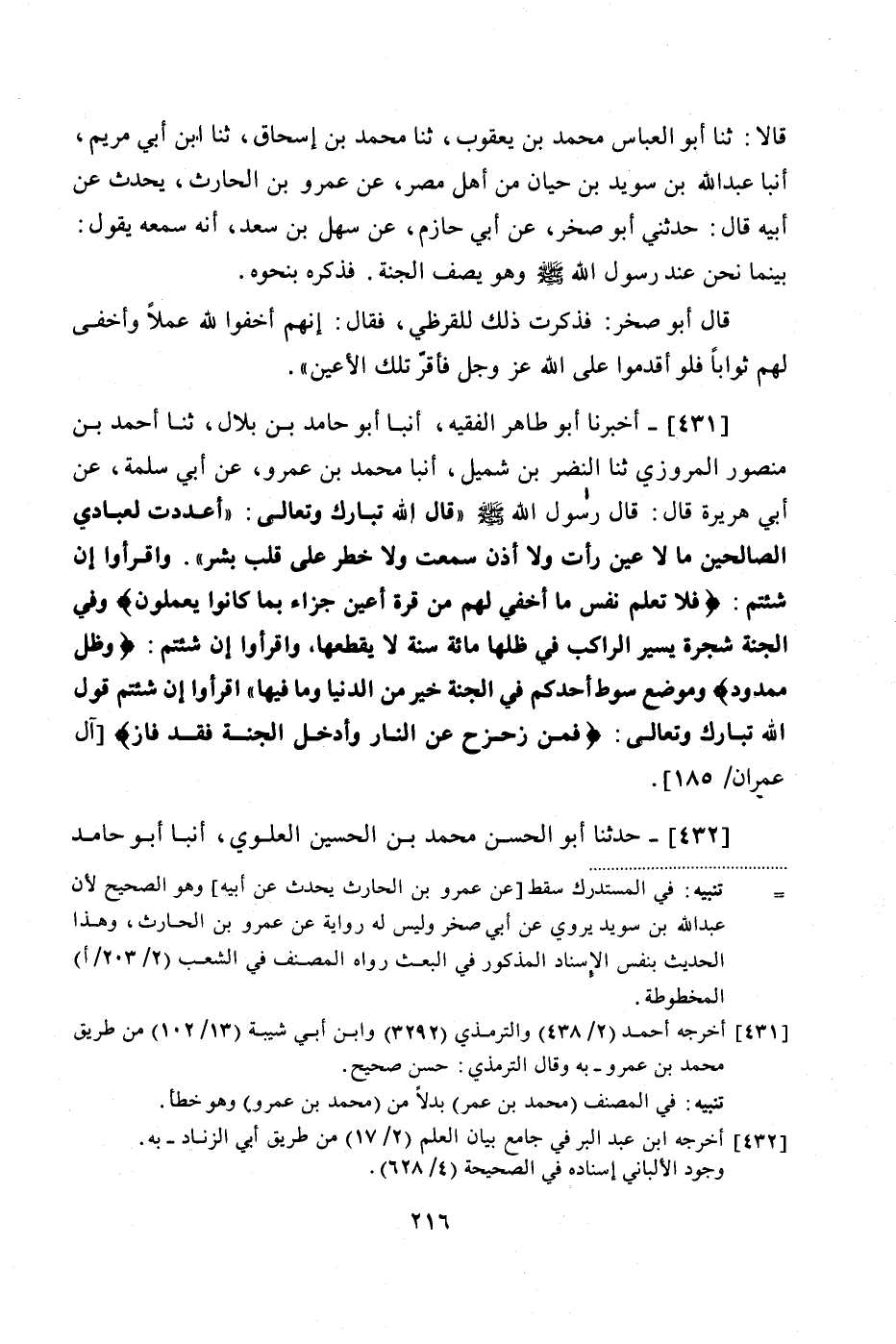 431 - (389) أَخْبَرَنَا أَبُو طَاهِرٍ الْفَقِيهُ، أَنْبَأَ أَبُو حَامِدِ بْنُ بِلَالٍ، ثنا أَحْمَدُ بْنُ مَنْصُورٍ الْمَرْوَزِيُّ، ثنا النَّضْرُ بْنُ شُمَيْلٍ، أَنْبَأَ مُحَمَّدُ بْنُ عَمْرٍو، عَنْ أَبِي سَلَمَةَ، عَنْ أَبِي هُرَيْرَةَ، قَالَ: قَالَ رَسُولُ اللَّهِ صَلَّى اللهُ عَلَيْهِ وَسَلَّمَ: قَالَ اللَّهُ تَبَارَكَ وَتَعَالَى: «أَعْدَدْتُ لِعِبَادِيَ الصَّالِحِينَ مَا لَا عَيْنٌ رَأَتْ، وَلَا أُذُنٌ سَمِعَتْ، وَلَا خَطَرَ عَلَى قَلْبِ بَشَرٍ»، وَاقْرَأوا إِنْ شِئْتُمْ: {فَلَا تَعْلَمُ نَفْسٌ مَا أُخْفِيَ لَهُمْ مِنْ قُرَّةِ أَعْيُنٍ جَزَاءً بِمَا كَانُوا يَعْمَلُونَ}، وَفِي الْجَنَّةِ شَجَرَةٌ يَسِيرُ الرَّاكِبُ فِي ظِلِّهَا مِائَةَ سَنَةٍ لَا يَقْطَعُهَا، وَاقْرَأوا إِنْ شِئْتُمْ: {وَظِلٍّ مَمْدُودٍ}، وَمَوْضِعُ سَوْطِ أَحَدِكُمْ فِي الْجَنَّةِ خَيْرٌ مِنَ الدُّنْيَا، وَمَا فِيهَا " اقْرَأوا إِنْ شِئْتُمْ قَوْلَ اللَّهِ تَبَارَكَ وَتَعَالَى: {فَمَنْ زُحْزِحَ عَنِ النَّارِ، وَأُدْخِلَ الْجَنَّةَ فَقَدْ فَازَ}