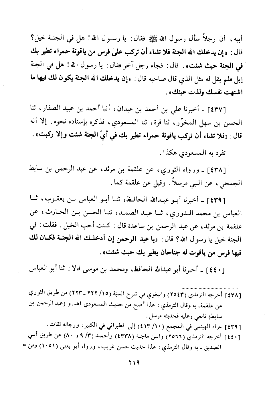 439 - (396) أَخْبَرَنَا أَبُو عَبْدِ اللَّهِ الْحَافِظُ، ثنا أَبُو الْعَبَّاسِ بْنُ يَعْقُوبَ، ثنا الْعَبَّاسُ بْنُ مُحَمَّدٍ الدُّورِيُّ، ثنا عَبْدُ الصَّمَدِ، ثنا الْحَسَنُ بْنُ الْحَارِثِ، عَنْ عَلْقَمَةَ بْنِ مَرْثَدٍ، عَنْ عَبْدِ الرَّحْمَنِ بْنِ سَاعِدَةَ، قَالَ: " كُنْتُ أُحِبُّ الْخَيْلَ، فَقُلْتُ: فِي الْجَنَّةِ خَيْلٌ يَا رَسُولَ اللَّهِ؟ قَالَ: يَا عَبْدَ الرَّحْمَنِ إِنْ أَدْخَلَكَ اللَّهُ الْجَنَّةَ، فَكَانَ لَكَ فِيهَا فَرَسٌ مِنْ يَاقُوتٍ لَهُ جَنَاحَانِ يَطِيرُ بِكَ حَيْثُ شِئْتَ "