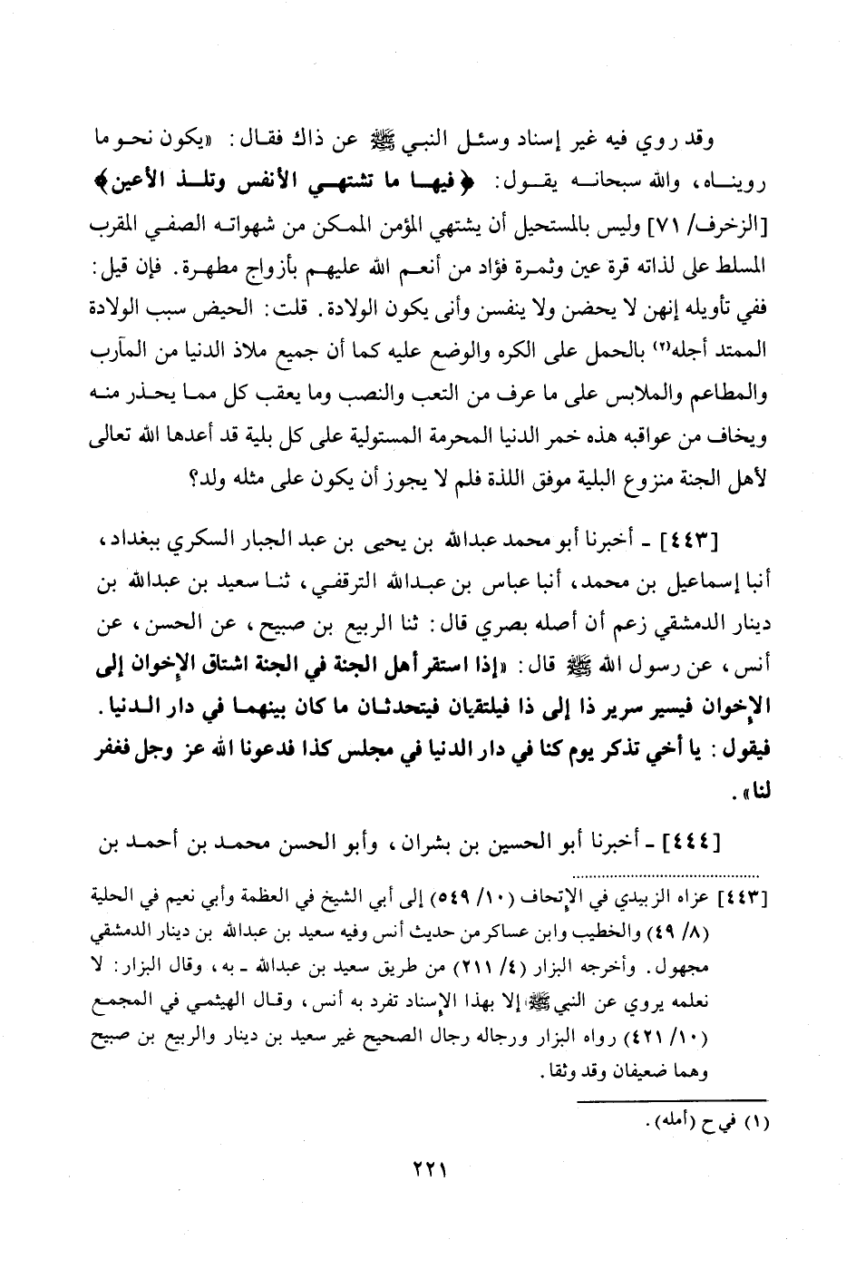 443 - (399) أَخْبَرَنَا أَبُو مُحَمَّدٍ عَبْدُ اللَّهِ بْنُ يَحْيَى بْنِ عَبْدِ الْجَبَّارِ السُّكَّرِيُّ، بِبَغْدَادَ، أَنْبَأَ إِسْمَاعِيلُ بْنُ مُحَمَّدٍ، أَنْبَأَ عَبَّاسُ بْنُ عَبْدِ اللَّهِ التَّرْقُفِيُّ، ثنا سَعِيدُ بْنُ عَبْدِ اللَّهِ بْنِ دِينَارِ الدِّمَشْقِيُّ، زَعَمَ أَنَّ أَصْلَهُ بَصْرِيٌّ، قَالَ: ثنا الرَّبِيعُ بْنُ صُبَيْحٍ، عَنِ الْحَسَنِ، عَنْ أَنَسٍ، عَنْ رَسُولِ اللَّهِ صَلَّى اللهُ عَلَيْهِ وَسَلَّمَ قَالَ: " إِذَا اسْتَقَرَّ أَهْلُ الْجَنَّةِ فِي الْجَنَّةِ اشْتَاقَ الْإِخْوَانُ إِلَى الْإِخْوَانِ، فَيَسِيرُ سَرِيرُ ذَا إِلَى ذَا فَيَلْتَقِيَانِ، فَيَتَحَدَّثَانِ مَا كَانَ بَيْنَهُمَا فِي دَارِ الدُّنْيَا، فَيَقُولُ: يَا أَخِي تَذْكُرُ يَوْمَ كُنَّا فِي دَارِ الدُّنْيَا، فِي مَجْلِسِ كَذَا، فَدَعَوْنَا اللَّهَ عَزَّ وَجَلَّ فَغَفَرَ لَنَا "