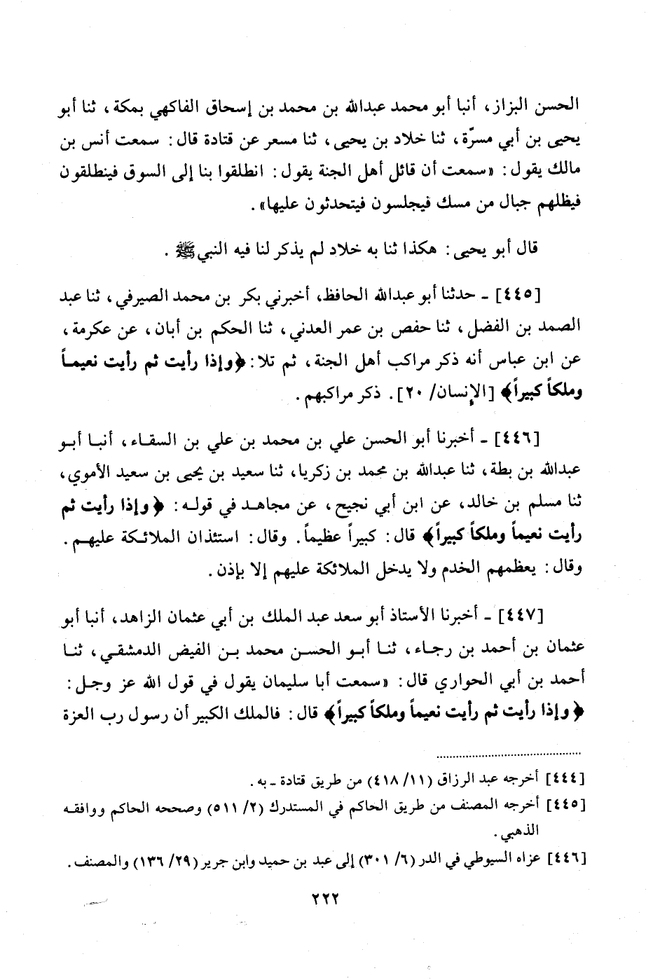 446 - (402) أَخْبَرَنَا أَبُو الْحَسَنِ عَلِيُّ بْنُ مُحَمَّدِ بْنِ عَلِيِّ بْنِ السَّقَّاءِ، أَنْبَأَ أَبُو عَبْدِ اللَّهِ بْنُ بَطَّةَ، ثنا عَبْدُ اللَّهِ بْنُ مُحَمَّدِ بْنِ زَكَرِيَّا، ثنا سَعِيدُ بْنُ يَحْيَى بْنِ سَعِيدٍ الْأُمَوِيُّ، ثنا مُسْلِمُ بْنُ خَالِدٍ، عَنِ ابْنِ أَبِي نَجِيحٍ، عَنْ مُجَاهِدٍ، فِي قَوْلِهِ: {وَإِذَا رَأَيْتَ ثَمَّ رَأَيْتَ نَعِيمًا وَمُلْكًا كَبِيرًا}، قَالَ: " كَبِيرًا عَظِيمًا، وَقَالَ: اسْتِئْذَانُ الْمَلَائِكَةِ عَلَيْهِمْ، وَقَالَ: يُعَظِّمُهُمُ الْخَدَمُ وَلَا يَدْخُلُ الْمَلَائِكَةُ عَلَيْهِمْ إِلَّا بِإِذْنٍ "