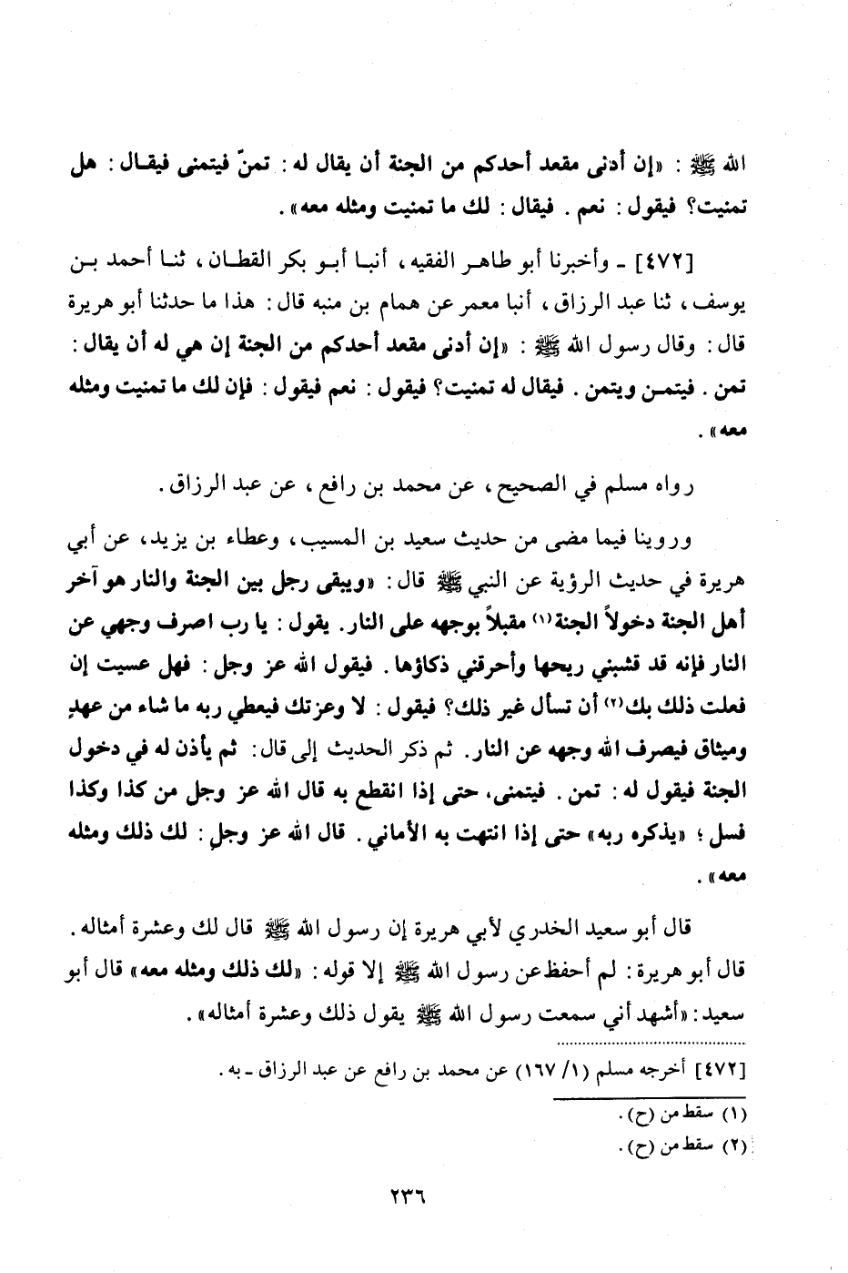 رَوَاهُ مُسْلِمٌ فِي الصَّحِيحِ عَنْ مُحَمَّدِ بْنِ رَافِعٍ، عَنْ عَبْدِ الرَّزَّاقِ، وَرُوِّينَا فِيمَا مَضَى مِنْ حَدِيثِ سَعِيدِ بْنِ الْمُسَيِّبِ، وَعَطَاءِ بْنِ يَزِيدَ، عَنْ أَبِي هُرَيْرَةَ فِي حَدِيثِ الرُّؤْيَةِ، عَنِ النَّبِيِّ صَلَّى اللهُ عَلَيْهِ وَسَلَّمَ قَالَ: " وَيَبْقَى رَجُلٌ بَيْنَ الْجَنَّةِ وَالنَّارِ هُوَ آخِرُ أَهْلِ الْجَنَّةِ دُخُولًا الجنة مُقْبِلًا بِوَجْهِهِ عَلَى النَّارِ، يَقُولُ: يَا رَبِّ اصْرِفْ وَجْهِي عَنِ النَّارِ، فَإِنَّهُ قَدْ قَشَبَنِي رِيحُهَا، وَأَحْرَقَنِي ذَكَاؤُهَا، فَيَقُولُ اللَّهُ عَزَّ وَجَلَّ: فَهَلْ عَسَيْتَ إِنْ فَعَلْتَ ذَلِكَ بك أَنْ تَسْأَلَ غَيْرَ ذَلِكَ، فَيَقُولُ: لَا وَعِزَّتِكَ، فَيُعْطِي رَبَّهُ مَا شَاءَ مِنْ عَهْدٍ وَمِيثَاقٍ، فَيَصْرِفُ اللَّهُ وَجْهَهُ عَنِ النَّارِ "، ثُمَّ ذَكَرَ الْحَدِيثَ إِلَى قَالَ: ثُمَّ يَاذَنُ لَهُ فِي دُخُولِ الْجَنَّةِ، فَيَقُولُ لَهُ: تَمَنَّ، فَيَتَمَنَّى، حَتَّى إِذَا انْقَطَعَ بِهِ قَالَ اللَّهُ عَزَّ وَجَلَّ: مِنْ كَذَا وَكَذَا فَسَلْ، يُذَكِّرُهُ رَبُّهُ، حَتَّى إِذَا انْتَهَتْ بِهِ الْأَمَانِيُّ قَالَ اللَّهُ عَزَّ وَجَلَّ: لَكَ ذَلِكَ وَمِثْلُهُ مَعَهُ قَالَ أَبُو سَعِيدٍ الْخُدْرِيُّ لِأَبِي هُرَيْرَةَ: إِنَّ رَسُولَ اللَّهِ صَلَّى اللهُ عَلَيْهِ وَسَلَّمَ قَالَ: «لَكَ وَعَشَرَةُ أَمْثَالِهِ»، قَالَ أَبُو هُرَيْرَةَ: لَمْ أَحْفَظْ عَنْ رَسُولِ اللَّهِ صَلَّى اللهُ عَلَيْهِ وَسَلَّمَ إِلَّا قَوْلَهُ: لَكَ ذَلِكَ وَمِثْلُهُ مَعَهُ، قَالَ أَبُو سَعِيدٍ: أَشْهَدُ أَنِّي سَمِعْتُ رَسُولَ اللَّهِ صَلَّى اللهُ عَلَيْهِ وَسَلَّمَ يَقُولُ: «ذَلِكَ وَعَشَرَةُ أَمْثَالِهِ»
