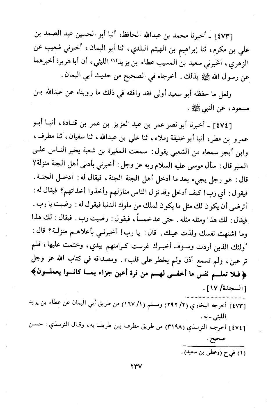 474 - (429) أَخْبَرَنَا أَبُو نَصْرٍ عُمَرُ بْنُ عَبْدِ الْعَزِيزِ بْنِ عُمَرَ بْنِ قَتَادَةَ، أَنْبَأَ أَبُو عَمْرِو بْنُ مَطَرٍ، أَنْبَأَ أَبُو خَلِيفَةَ، إِمْلَاءً، ثنا عَلِيُّ بْنُ عَبْدِ اللَّهِ، ثنا سُفْيَانُ، ثنا مُطَرِّفٌ، وَابْنُ أَبْجَرَ، سَمِعَاهُ مِنَ الشَّعْبِيِّ، يَقُولُ: سَمِعْتُ الْمُغِيرَةِ بْنَ شُعْبَةَ، يُخْبِرُ النَّاسَ عَلَى الْمِنْبَرِ قَالَ: سَأَلَ مُوسَى عَلَيْهِ السَّلَامُ رَبَّهُ عَزَّ وَجَلَّ: " أَخْبِرْنِي بِأَدْنَى أَهْلِ الْجَنَّةِ مَنْزِلَةً؟ قَالَ: هُوَ رَجُلٌ يَجِيءُ بَعْدَمَا أُدْخِلَ أَهْلُ الْجَنَّةِ الْجَنَّةَ، فَيُقَالُ لَهُ: ادْخُلِ الْجَنَّةَ، فَيَقُولُ: أَيْ رَبِّ، كَيْفَ أَدْخُلُ وَقَدْ نَزَلَ النَّاسُ مَنَازِلَهُمْ، وَأَخَذُوا أَخْذَاتِهِمْ، فَيُقَالُ لَهُ: أَتَرْضَى أَنْ يَكُونَ لَكَ مِثْلُ مَا يَكُونُ لِمَلِكٍ مِنْ مُلُوكِ الدُّنْيَا، فَيَقُولُ لَهُ: رَضِيتُ يَا رَبِّ، فَيُقَالُ: لَكَ هَذَا وَمِثْلُهُ مِثْلُهُ، حَتَّى عَدَّ خَمْسًا، فَيَقُولُ: رَضِيتُ رَبِّ، فَيُقَالُ: لَكَ هَذَا وَمَا اشْتَهَتْ نَفْسُكَ وَلَذَّتْ عَيْنُكَ، قَالَ: يَا رَبِّ، أَخْبِرْنِي بِأَعْلَاهُمْ مَنْزِلَةً؟ قَالَ: أُولَئِكَ الَّذِينَ أَرَدْتُ، وَسَوْفَ أُخْبِرُكَ، غَرَسْتُ كَرَامَتَهُمْ بِيَدِي، وَخَتَمْتُ عَلَيْهَا، فَلَمْ تَرَ عَيْنٌ، وَلَمْ تَسْمَعْ أُذُنٌ، وَلَمْ يَخْطِرْ عَلَى قَلْبٍ، وَمِصْدَاقُهُ فِي كِتَابِ اللَّهِ عَزَّ وَجَلَّ: {فَلَا تَعْلَمُ نَفْسٌ مَا أُخْفِيَ لَهُمْ مِنْ قُرَّةِ أَعْيُنٍ جَزَاءً بِمَا كَانُوا يَعْمَلُونَ} "