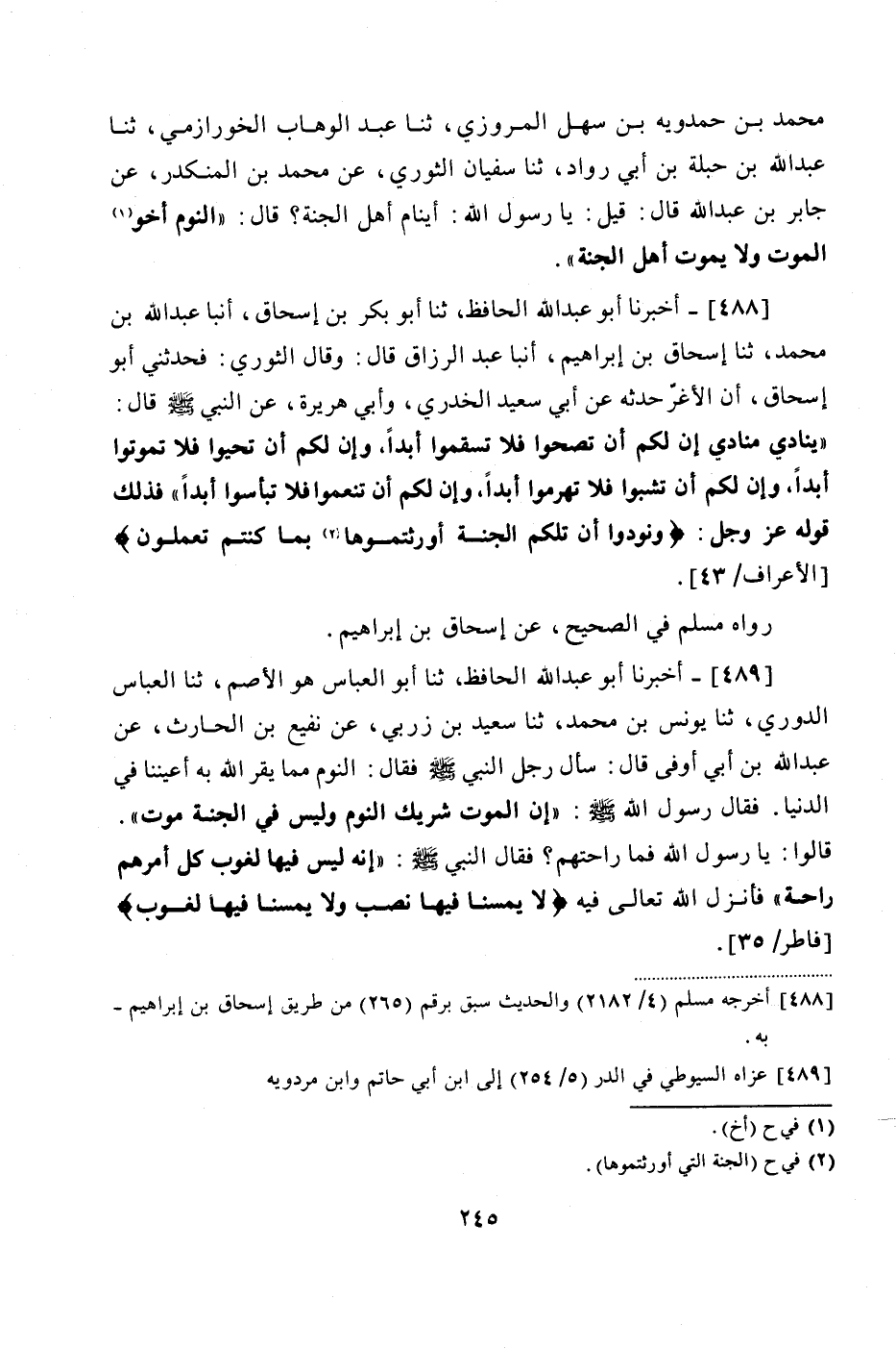 489 - (444) أَخْبَرَنَا أَبُو عَبْدِ اللَّهِ الْحَافِظُ، ثنا أَبُو الْعَبَّاسِ هُوَ الْأَصَمُّ، ثنا الْعَبَّاسُ الدُّورِيُّ، ثنا يُونُسُ بْنُ مُحَمَّدٍ، ثنا سَعِيدُ بْنُ زَرْبَى، عَنْ نُفَيْعِ بْنِ الْحَارِثِ، عَنْ عَبْدِ اللَّهِ بْنِ أَبِي أَوْفَى، قَالَ: سَأَلَ رَجُلٌ النَّبِيَّ صَلَّى اللهُ عَلَيْهِ وَسَلَّمَ فَقَالَ: النَّوْمُ مِمَّا يُقِرُّ اللَّهُ بِهِ أَعْيُنَنَا فِي الدُّنْيَا، فَقَالَ رَسُولُ اللَّهِ صَلَّى اللهُ عَلَيْهِ وَسَلَّمَ: «إِنَّ الْمَوْتَ شَرِيكُ النَّوْمِ، وَلَيْسَ فِي الْجَنَّةِ مَوْتٌ»، قَالُوا: يَا رَسُولَ اللَّهِ، فَمَا رَاحَتُهُمْ؟ فَقَالَ النَّبِيُّ صَلَّى اللهُ عَلَيْهِ وَسَلَّمَ: «إِنَّهُ لَيْسَ فِيهَا لُغُوبٌ، كُلُّ أَمْرِهِمْ رَاحَةٌ»، فَأَنْزَلَ اللَّهُ تَعَالَى فِيهِ: {لَا يَمَسُّنَا فِيهَا نَصَبٌ وَلَا يَمَسُّنَا فِيهَا لُغُوبٌ}