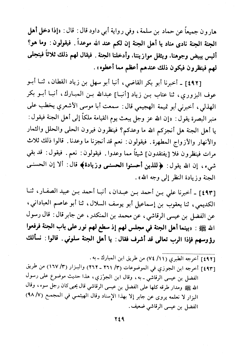 492 - (447) أَخْبَرَنَا أَبُو بَكْرٍ الْقَاضِي، أَنْبَأَ أَبُو سَهْلِ بْنُ زِيَادٍ الْقَطَّانُ، ثنا أَبُو عَوْفٍ الْبُزُورِيُّ، ثنا عَتَّابُ بْنُ زِيَادٍ، أَنْبَأَ عَبْدُ اللَّهِ بْنُ الْمُبَارَكِ، أَنْبَأَ أَبُو بَكْرٍ الْهُذَلِيُّ، أَخْبَرَنِي أَبُو تَمِيمَةَ الْهُجَيْمِيُّ، قَالَ: سَمِعْتُ أَبَا مُوسَى الْأَشْعَرِيَّ، يَخْطُبُ عَلَى مِنْبَرِ الْبَصْرَةِ يَقُولُ: إِنَّ اللَّهَ عَزَّ وَجَلَّ يَبْعَثُ يَوْمَ الْقِيَامَةِ مَلَكًا إِلَى أَهْلِ الْجَنَّةِ فَيَقُولُ: يَا أَهْلَ الْجَنَّةِ، هَلْ أَنْجَزَكُمُ اللَّهُ مَا وَعَدَكُمْ؟ فَيَنْظُرُونَ فَيَرَوْنَ الْحُلِيَّ وَالْحُلَلَ وَالثِّمَارَ وَالْأَنْهَارَ وَالْأَزْوَاجَ الْمُطَهَّرَةَ، فَيَقُولُونَ: نَعَمْ قَدْ أَنْجَزَنَا مَا وَعَدَنَا، قَالُوا ذَلِكَ ثَلَاثَ مَرَّاتٍ، فَيَنْظُرُونَ فَلَا يَفْتَقِدُونَ شَيْئًا مِمَّا وُعِدُوا، فَيَقُولُونَ: نَعَمْ، فَيَقُولُ: قَدْ بَقِيَ شَيْءٌ، إِنَّ اللَّهَ يَقُولُ: {لِلَّذِينَ أَحْسَنُوا الْحُسْنَى وَزِيَادَةٌ}، قَالَ: أَلَا إِنَّ الْحُسْنَى الْجَنَّةُ، وَزِيَادَةٌ النَّظَرُ إِلَى وَجْهِ اللَّهِ "