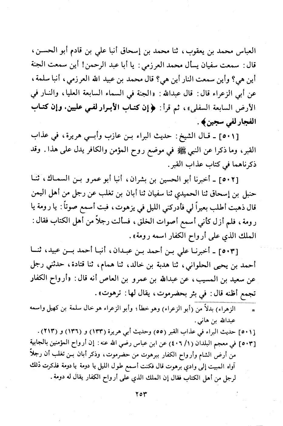502 - (456) أَخْبَرَنَا أَبُو الْحُسَيْنِ بْنُ بُشْرَانَ، أَنْبَأَ أَبُو عَمْرِو بْنُ السَّمَّاكِ، ثنا حَنْبَلُ بْنُ إِسْحَاقَ، ثنا الْحُمَيْدِيُّ، ثنا سُفْيَانُ، ثنا أَبَانُ بْنُ تَغْلِبَ، عَنْ رَجُلٍ، مِنْ أَهْلِ الْيَمَنِ قَالَ: " ذَهَبْتُ أَطْلُبُ بَعِيرًا لِي، فَأَدْرَكَنِي اللَّيْلُ فِي يَزْهُوتَ، فَبِتُّ أَسْمَعُ صَوْتًا: يَا رُومَةُ، يَا رُومَةُ، فَلَمْ أَزَلْ كَأَنِّي أَسْمَعُ أَصْوَاتَ الْخَلْقِ، فَسَأَلْتُ رَجُلًا مِنْ أَهْلِ الْكِتَابِ، فَقَالَ: الْمَلَكُ الَّذِي عَلَى أَرْوَاحِ الْكُفَّارِ اسْمُهُ رُومَةَ "