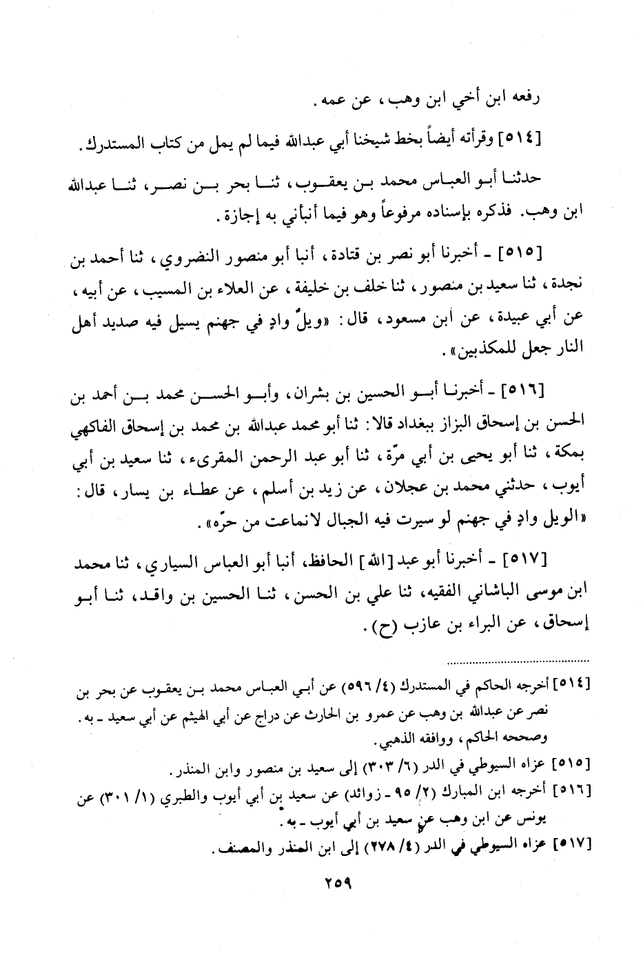 515 - (467) أَخْبَرَنَا أَبُو نَصْرِ بْنُ قَتَادَةَ، أَنْبَأَ أَبُو مَنْصُورٍ النَّضْرَوِيُّ، ثنا أَحْمَدُ بْنُ نَجْدَةَ، ثنا سَعِيدُ بْنُ مَنْصُورٍ، ثنا خَلَفُ بْنُ خَلِيفَةَ، عَنِ الْعَلَاءِ بْنِ الْمُسَيَّبِ، عَنْ أَبِيهِ، عَنْ أَبِي عُبَيْدَةَ، عَنِ ابْنِ مَسْعُودٍ، قَالَ: «وَيْلٌ وَادٍ فِي جَهَنَّمَ يَسِيلُ فِيهِ صَدِيدُ أَهْلِ النَّارِ جُعِلَ لِلْمُكَذِّبِينَ»