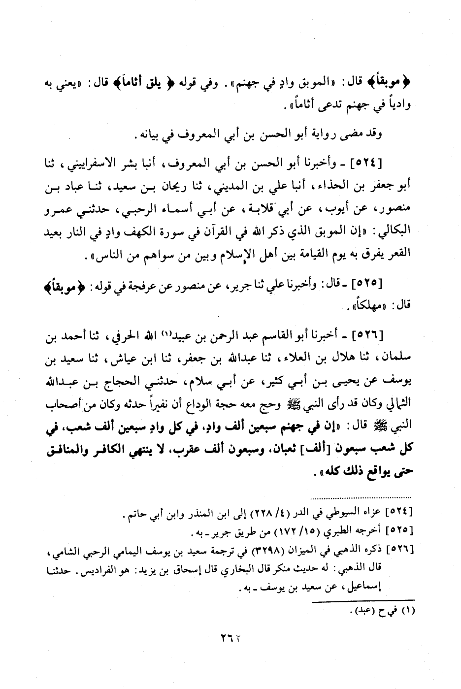 526 - (478) أَخْبَرَنَا أَبُو الْقَاسِمِ عَبْدُ الرَّحْمَنِ بْنُ عبيدِ اللَّهِ الْحُرْفِيُّ، ثنا أَحْمَدُ بْنُ سَلْمَانَ، ثنا هِلَالُ بْنُ الْعَلَاءِ، ثنا عَبْدُ اللَّهِ بْنُ جَعْفَرٍ، ثنا ابْنُ عَيَّاشٍ، ثنا سَعِيدُ بْنُ يُوسُفَ، عَنْ يَحْيَى بْنِ أَبِي كَثِيرٍ، عَنْ أَبِي سَلَّامٍ، حَدَّثَنِي الْحَجَّاجُ بْنُ عَبْدِ اللَّهِ الثُّمَالِيُّ وَكَانَ قَدْ رَأَى النَّبِيَّ صَلَّى اللهُ عَلَيْهِ وَسَلَّمَ وَحَجَّ مَعَهُ حَجَّةَ الْوَدَاعِ، أَنَّ نُفَيْرًا حَدَّثَهُ، وَكَانَ مِنْ أَصْحَابِ النَّبِيِّ صَلَّى اللهُ عَلَيْهِ وَسَلَّمَ، قَالَ: إِنَّ فِيَ جَهَنَّمَ سَبْعِينَ أَلْفَ وَادٍ، فِي كُلِّ وَادٍ سَبْعِينَ أَلْفَ شِعْبٍ، فِي كُلِّ شِعْبٍ سَبْعُونَ أَلْفَ ثُعْبَانٍ، وَسَبْعُونَ أَلْفَ عَقْرَبٍ، لَا يَنْتَهِي الْكَافِرُ وَالْمُنَافِقُ حَتَّى يُوَاقِعُ ذَلِكَ كُلَّهُ "