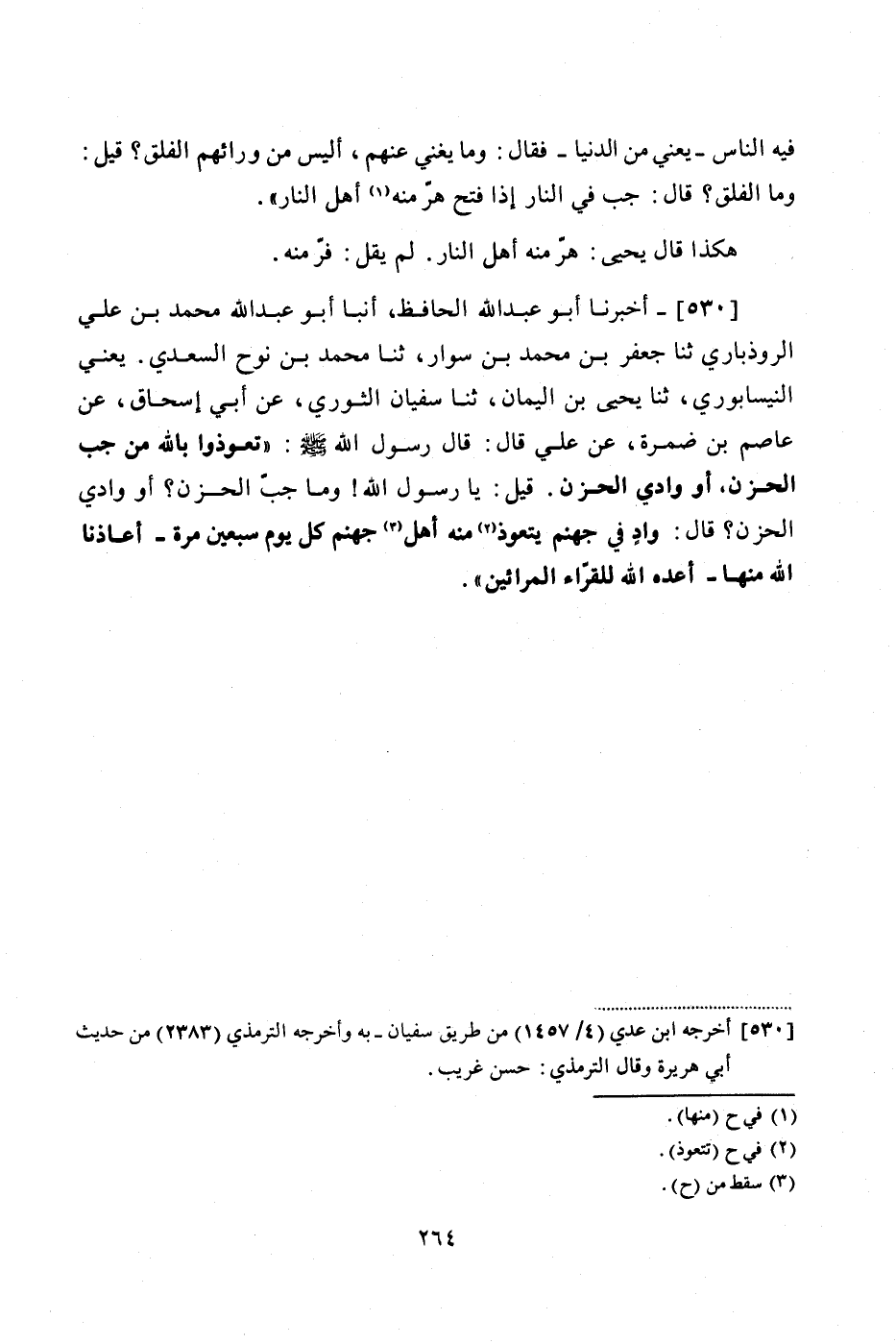 530 - (481) أَخْبَرَنَا أَبُو عَبْدِ اللَّهِ الْحَافِظُ، أَنْبَأَ أَبُو عَبْدِ اللَّهِ مُحَمَّدُ بْنُ عَلِيٍّ الرُّوذْبَارِيُّ، ثنا جَعْفَرُ بْنُ مُحَمَّدِ بْنِ سَوَّارٍ، ثنا مُحَمَّدُ بْنُ نُوحٍ السَّعْدِيُّ يَعْنِي النَّيْسَابُورِيَّ، ثنا يَحْيَى بْنُ الْيَمَانِ، ثنا سُفْيَانُ الثَّوْرِيُّ، عَنْ أَبِي إِسْحَاقَ، عَنْ عَاصِمِ بْنِ ضَمْرَةَ، عَنْ عَلِيٍّ، قَالَ: قَالَ رَسُولُ اللَّهِ صَلَّى اللهُ عَلَيْهِ وَسَلَّمَ: «تَعَوَّذُوا بِاللَّهِ مِنْ جُبِّ الْحُزْنِ، أَوْ وَادِي الْحُزْنِ»، قِيلَ: يَا رَسُولَ اللَّهِ، وَمَا جُبُّ الْحُزْنِ، أَوْ وَادِي الْحُزْنِ؟ قَالَ: «وَادٍ فِي جَهَنَّمَ يتَعَوَّذُ مِنْهُ أهل جَهَنَّمُ كُلَّ يَوْمٍ سَبْعِينَ مَرَّةً، أَعَاذَنَا اللَّهُ مِنْهَا، أَعَدَّهُ اللَّهُ لِلْقُرَّاءِ الْمُرَائِينَ»