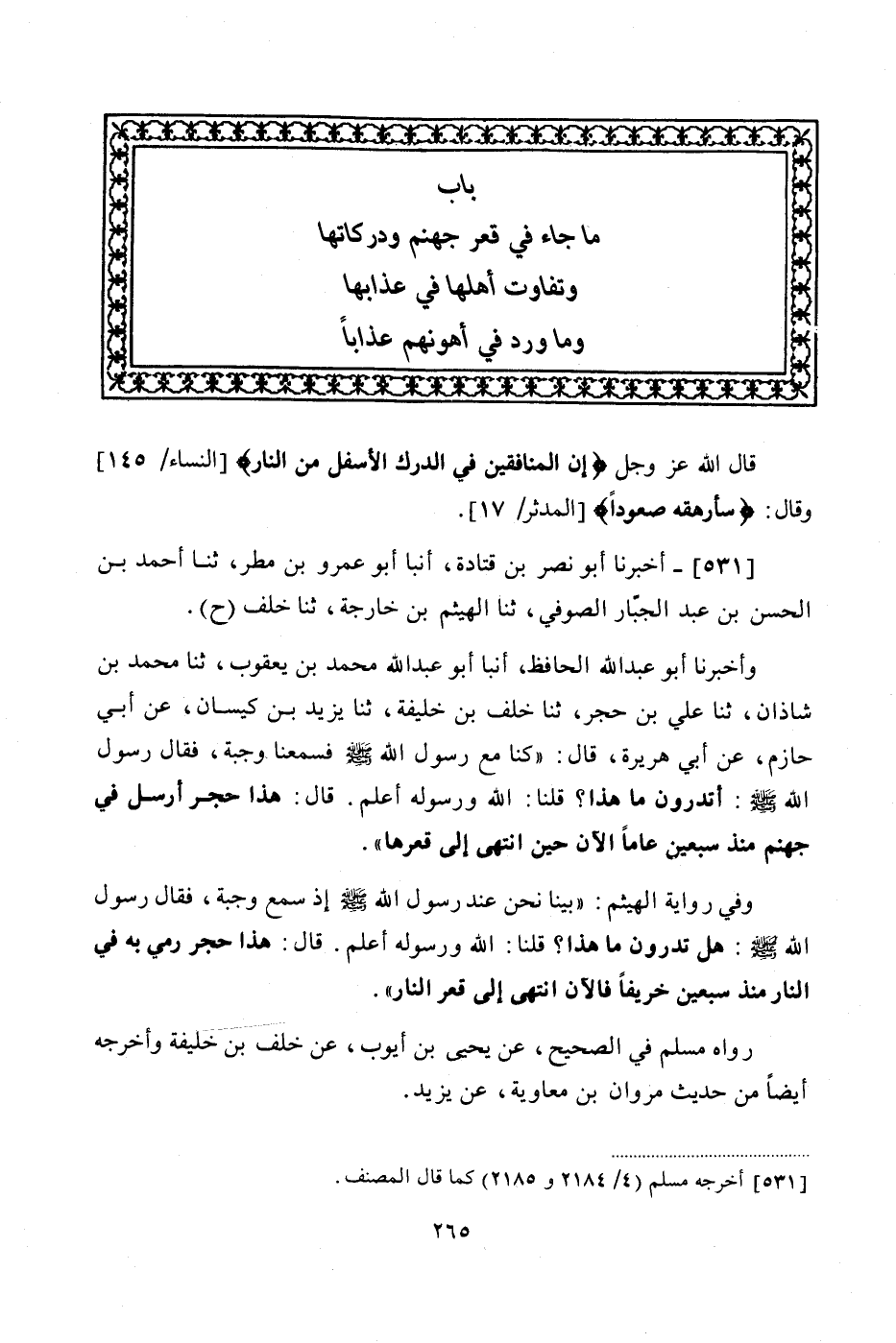 بَابُ مَا جَاءَ فِي قَعْرِ جَهَنَّمَ وَدَرَكَاتِهَا، وَتَفَاوُتِ أَهْلِهَا فِي عَذَابِهَا، وَمَا وَرَدَ فِي أَهْوَنِهِمْ عَذَابًا