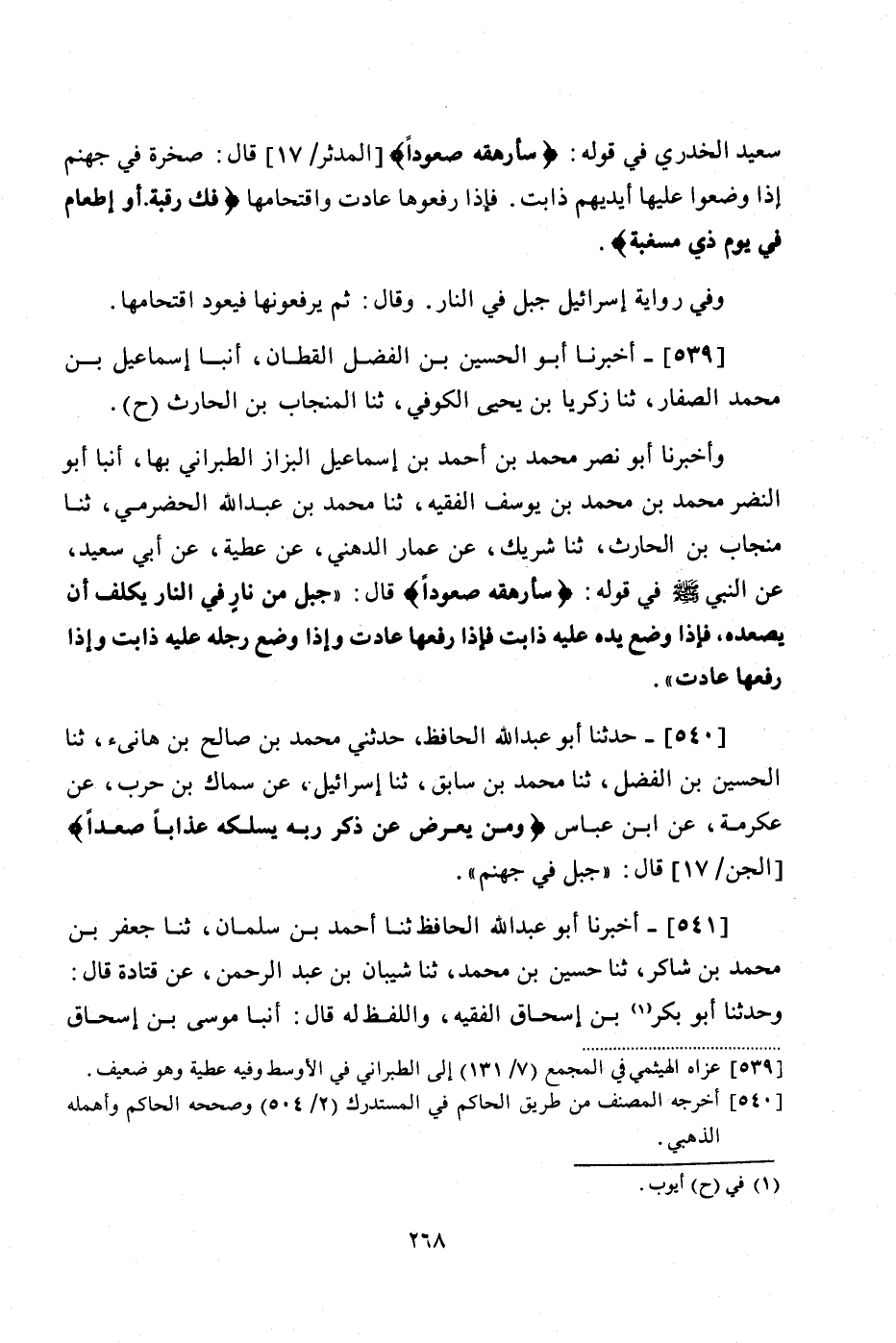 وَأَخْبَرَنَا أَبُو نَصْرٍ مُحَمَّدُ بْنُ أَحْمَدَ بْنِ إِسْمَاعِيلَ الْبَزَّازُ الطَّبَرَانِيُّ بِهَا، أَنْبَأَ أَبُو النَّضْرِ مُحَمَّدُ بْنُ مُحَمَّدِ بْنِ يُوسُفَ الْفَقِيهُ، ثنا مُحَمَّدُ بْنُ عَبْدِ اللَّهِ الْحَضْرَمِيُّ، ثنا مِنْجَابُ بْنُ الْحَارِثِ، ثنا شَرِيكٌ، عَنْ عَمَّارٍ الدُّهْنِيِّ، عَنْ عَطِيَّةَ، عَنْ أَبِي سَعِيدٍ، عَنِ النَّبِيِّ صَلَّى اللهُ عَلَيْهِ وَسَلَّمَ فِي قَوْلِهِ: {سَأُرْهِقُهُ صَعُودًا}، قَالَ: «جَبَلٌ مِنْ نَارٍ فِي النَّارِ، يُكَلَّفُ أَنْ يَصْعَدَهُ، فَإِذَا وَضَعَ يَدَهُ عَلَيْهِ ذَابَتْ، فَإِذَا رَفَعَهَا عَادَتْ، وَإِذَا وَضَعَ رِجْلَهُ عَلَيْهِ ذَابَتْ، وَإِذَا رَفَعَهَا عَادَتْ»