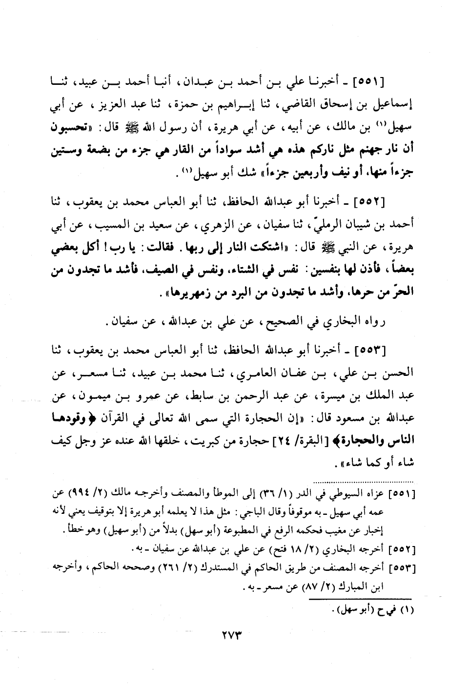 552 - (502) أَخْبَرَنَا أَبُو عَبْدِ اللَّهِ الْحَافِظُ، ثنا أَبُو الْعَبَّاسِ مُحَمَّدُ بْنُ يَعْقُوبَ، ثنا أَحْمَدُ بْنُ شَيْبَانَ الرَّمْلِيُّ، ثنا سُفْيَانُ، عَنِ الزُّهْرِيِّ، عَنْ سَعِيدِ بْنِ الْمُسَيِّبِ، عَنْ أَبِي هُرَيْرَةَ، عَنِ النَّبِيِّ صَلَّى اللهُ عَلَيْهِ وَسَلَّمَ قَالَ: " اشْتَكَتِ النَّارُ إِلَى رَبِّهَا فَقَالَتْ: يَا رَبِّ، أَكَلَ بَعْضِي بَعْضًا، فَاذَنْ لَهَا بِنَفَسَيْنِ، نَفَسٍ فِي الشِّتَاءِ، وَنَفَسٍ فِي الصَّيْفِ، فَأَشَدُّ مَا تَجِدُونَ مِنَ الْحَرِّ مِنْ حَرِّهَا، وَأَشَدُّ مَا تَجِدُونَ مِنَ الْبَرْدِ مِنْ زَمْهَرِيرِهَا "