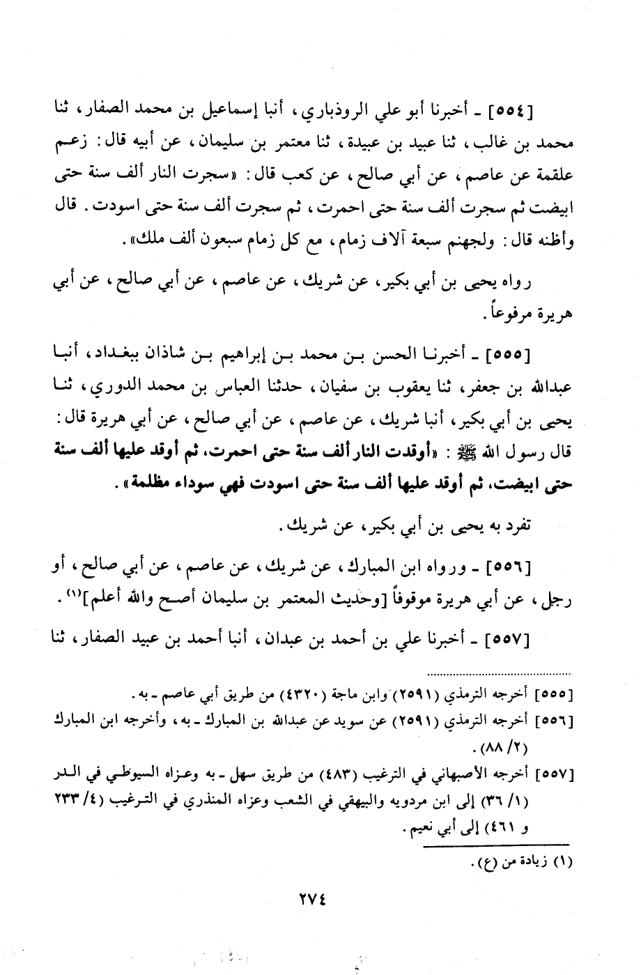 555 - (505) أَخْبَرَنَا الْحَسَنُ بْنُ أَحْمَدَ بْنِ إِبْرَاهِيمَ بْنِ شَاذَانَ، بِبَغْدَادَ، أَنْبَأَ عَبْدُ اللَّهِ بْنُ جَعْفَرٍ، ثنا يَعْقُوبُ بْنُ سُفْيَانَ، حَدَّثَنَا الْعَبَّاسُ بْنُ مُحَمَّدٍ الدُّورِيُّ، ثنا يَحْيَى بْنُ أَبِي بُكَيْرٍ، أَنْبَأَ شَرِيكٌ، عَنْ عَاصِمٍ، عَنْ أَبِي صَالِحٍ، عَنْ أَبِي هُرَيْرَةَ، قَالَ: قَالَ رَسُولُ اللَّهِ صَلَّى اللهُ عَلَيْهِ وَسَلَّمَ: «أُوقِدَتِ النَّارُ أَلْفَ سَنَةٍ حَتَّى احْمَرَّتْ، ثُمَّ أُوقِدَ عَلَيْهَا أَلْفُ سَنَةٍ حَتَّى ابْيَضَّتْ، ثُمَّ أُوقِدَ عَلَيْهَا أَلْفُ سَنَةٍ حَتَّى اسْوَدَّتْ، فَهِيَ سَوْدَاءُ مُظْلِمَةٌ»