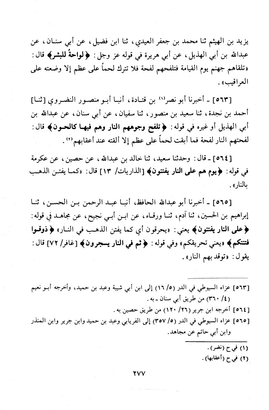 563 - (512) أَخْبَرَنَا أَبُو نَصْرِ بْنُ قَتَادَةَ، أَنْبَأَ أَبُو مَنْصُورٍ النَّضْرَوِيُّ، ثنا أَحْمَدُ بْنُ نَجْدَةَ، ثنا سَعِيدُ بْنُ مَنْصُورٍ، ثنا سُفْيَانُ، عَنْ أَبِي سِنَانٍ، عَنْ عَبْدِ اللَّهِ بْنِ أَبِي الْهُذَيْلِ، أَوْ غَيْرِهِ، فِي قَوْلِهِ: {تَلْفَحُ وُجُوهَهُمُ النَّارُ وَهُمْ فِيهَا كَالِحُونَ}، قَالَ: لَفَحَتْهُمُ النَّارُ لَفْحَةً فَمَا أَبْقَتْ لَحْمًا عَلَى عَظْمٍ إِلَّا أَلْقَتْهُ عِنْدَ أَعْقَابِهَا "