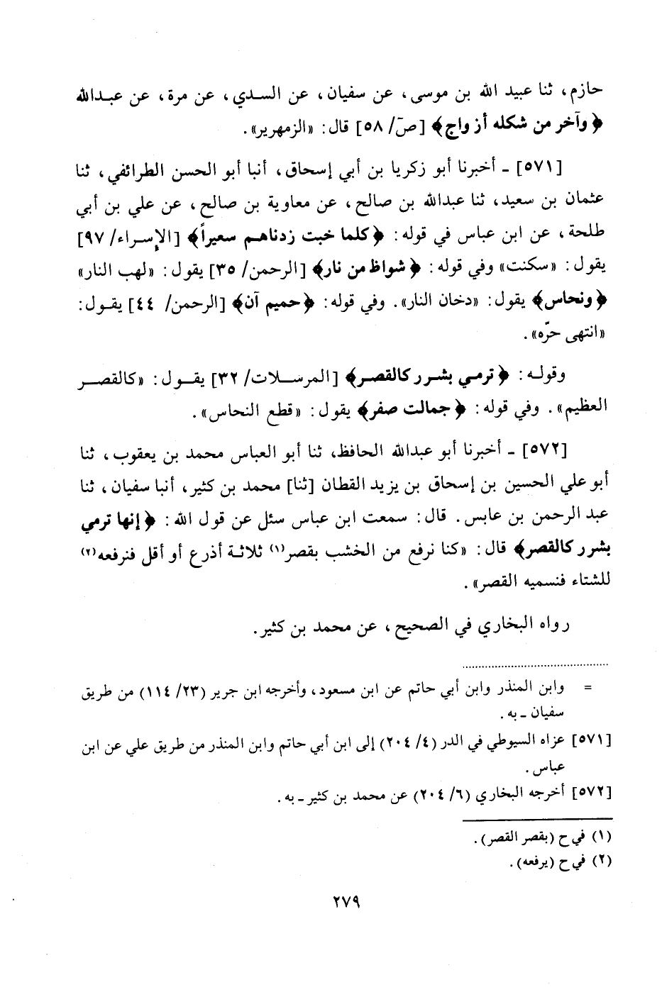 572 - (520) أَخْبَرَنَا أَبُو عَبْدِ اللَّهِ الْحَافِظُ، ثنا أَبُو الْعَبَّاسِ مُحَمَّدُ بْنُ يَعْقُوبَ، ثنا أَبُو عَلِيٍّ الْحُسَيْنُ بْنُ إِسْحَاقَ بْنِ يَزِيدَ الْقَطَّانُ، ثنا مُحَمَّدُ بْنُ كَثِيرٍ، أنبا سُفْيَانُ، ثنا عَبْدُ الرَّحْمَنِ بْنُ عَابِسٍ، قَالَ: سَمِعْتُ ابْنَ عَبَّاسٍ، سُئِلَ عَنْ قَوْلِ اللَّهِ: {إِنَّهَا تَرْمِي بِشَرَرٍ كَالْقَصْرِ}، قَالَ: كُنَّا نَرْفَعُ مِنَ الْخَشَبِ بِقَصْرِ ثَلَاثَةَ أَذْرُعٍ أَوْ أَقَلَّ، فنَرْفَعُهُ لِلشِّتَاءِ فَنُسَمِّيهِ الْقَصْرَ "