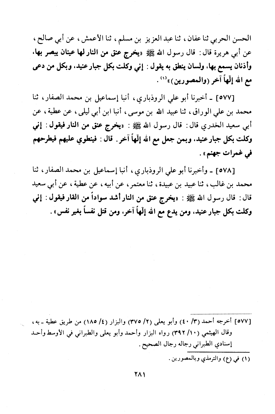 577 - (525) أَخْبَرَنَا أَبُو عَلِيٍّ الرُّوذْبَارِيُّ، أَنْبَأَ إِسْمَاعِيلُ بْنُ مُحَمَّدٍ الصَّفَّارُ، ثنا مُحَمَّدُ بْنُ عَلِيٍّ الْوَرَّاقُ، ثنا عُبَيْدُ اللَّهِ بْنُ مُوسَى، أَنْبَأَ ابْنُ أَبِي لَيْلَى، عَنْ عَطِيَّةَ، عَنْ أَبِي سَعِيدٍ الْخُدْرِيِّ، قَالَ: قَالَ رَسُولُ اللَّهِ صَلَّى اللهُ عَلَيْهِ وَسَلَّمَ: " يَخْرُجُ عُنُقٌ مِنَ النَّارِ فَيَقُولُ: إِنِّي وُكِّلْتُ بِكُلِّ جَبَّارٍ عَنِيدٍ، وَبِمَنْ جَعَلَ مَعَ اللَّهِ إِلَهًا آخَرَ " قَالَ: «فَيَنْطَوِي عَلَيْهِمْ فَيْطَرَحُهُمْ فِي غَمَرَاتِ جَهَنَّمَ»