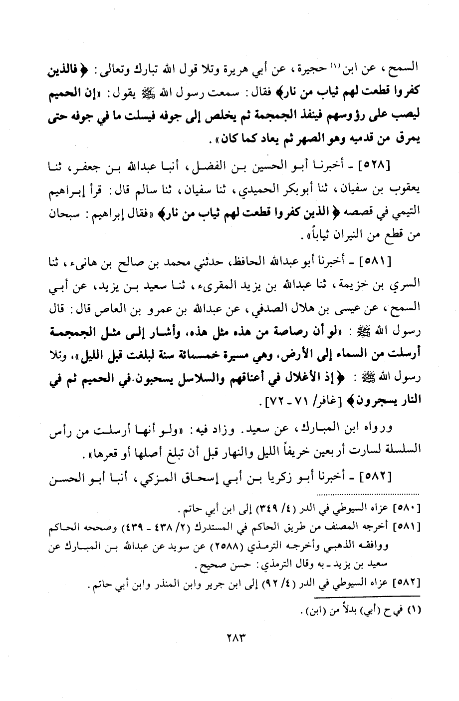 581 - (529) أَخْبَرَنَا أَبُو عَبْدِ اللَّهِ الْحَافِظُ، حَدَّثَنِي مُحَمَّدُ بْنُ صَالِحِ بْنِ هَانِئٍ، ثنا السَّرِيُّ بْنُ خُزَيْمَةَ، ثنا عَبْدُ اللَّهِ بْنُ يَزِيدَ الْمُقْرِئُ، ثنا سَعِيدُ بْنُ يَزِيدَ، عَنْ أَبِي السَّمْحِ، عَنْ عِيسَى بْنِ هِلَالٍ الصَّدَفِيِّ، عَنْ عَبْدِ اللَّهِ بْنِ عَمْرِو بْنِ الْعَاصِ، قَالَ: قَالَ رَسُولُ اللَّهِ صَلَّى اللهُ عَلَيْهِ وَسَلَّمَ: «لَوْ أَنَّ رَصَاصَةً مِنْ هَذِهِ مِثْلُ هَذِهِ، وَأَشَارَ إِلَى مِثْلِ الْجُمْجُمَةِ، أُرْسِلَتْ مِنَ السَّمَاءِ إِلَى الْأَرْضِ، وَهِيَ مَسِيرَةُ خَمْسِمِائَةِ سَنَةٍ لَبَلَغَتْ قَبْلَ اللَّيْلِ»، وَتَلَا رَسُولُ اللَّهِ صَلَّى اللهُ عَلَيْهِ وَسَلَّمَ: {إِذِ الْأَغْلَالُ فِي أَعْنَاقِهِمْ وَالسَّلَاسِلُ يُسْحَبُونَ فِي الْحَمِيمِ ثُمَّ فِي النَّارِ يُسْجَرُونَ} وَرَوَاهُ ابْنُ الْمُبَارَكِ عَنْ سَعِيدٍ، وَزَادَ فِيهِ: «وَلَوْ أَنَّهَا أُرْسِلَتْ مِنْ رَاسِ السِّلْسِلَةِ لَسَارَتْ أَرْبَعِينَ خَرِيفًا اللَّيْلَ وَالنَّهَارَ، قَبْلَ أَنْ تَبْلُغَ أَصْلَهَا أَوْ قَعْرَهَا»