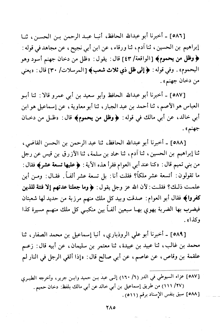 588 - (535) أَخْبَرَنَا أَبُو عَبْدِ اللَّهِ الْحَافِظُ، ثنا عَبْدُ الرَّحْمَنِ بْنُ الْحَسَنِ الْقَاضِي، ثنا إِبْرَاهِيمُ بْنُ الْحُسَيْنِ، ثنا آدَمُ، ثنا حَمَّادُ بْنُ سَلَمَةَ، ثنا الْأَزْرَقُ بْنُ قَيْسٍ، عَنْ رَجُلٍ، مِنْ بَنِي تَمِيمٍ قَالَ: كُنَّا عِنْدَ أَبِي الْعَوَّامِ فَقَرَأَ هَذِهِ الْآيَةَ {عَلَيْهَا تِسْعَةَ عَشَرَ}، فَقَالَ: مَا تَقُولُونَ، أَتِسْعَةَ عَشَرَ مَلَكًا؟ فَقُلْتُ أَنَا: بَلْ تِسْعَةَ عَشَرَ أَلْفًا، فَقَالَ: وَمِنْ أَيْنَ عَلِمْتَ ذَلِكَ؟، فَقُلْتُ: لِأَنَّ اللَّهَ عَزَّ وَجَلَّ يَقُولُ: {وَمَا جَعَلْنَا عِدَّتَهُمْ إِلَّا فِتْنَةً لِلَّذِينَ كَفَرُوا}، فَقَالَ أَبُو الْعَوَّامِ: صَدَقْتَ، وَبِيَدِ كُلِّ مَلَكٍ مِنْهُمْ مِرْزَبَّةٌ مِنْ حَدِيدٍ لَهَا شُعْبَتَانِ، فَيَضْرِبُ بِهَا الضَّرْبَةَ يَهْوِي بِهَا سَبْعِينَ أَلْفًا، بَيْنَ مَنْكِبَيْ كُلِّ مَلَكٍ مِنْهُمْ مَسِيرَةُ كَذَا وَكَذَا "