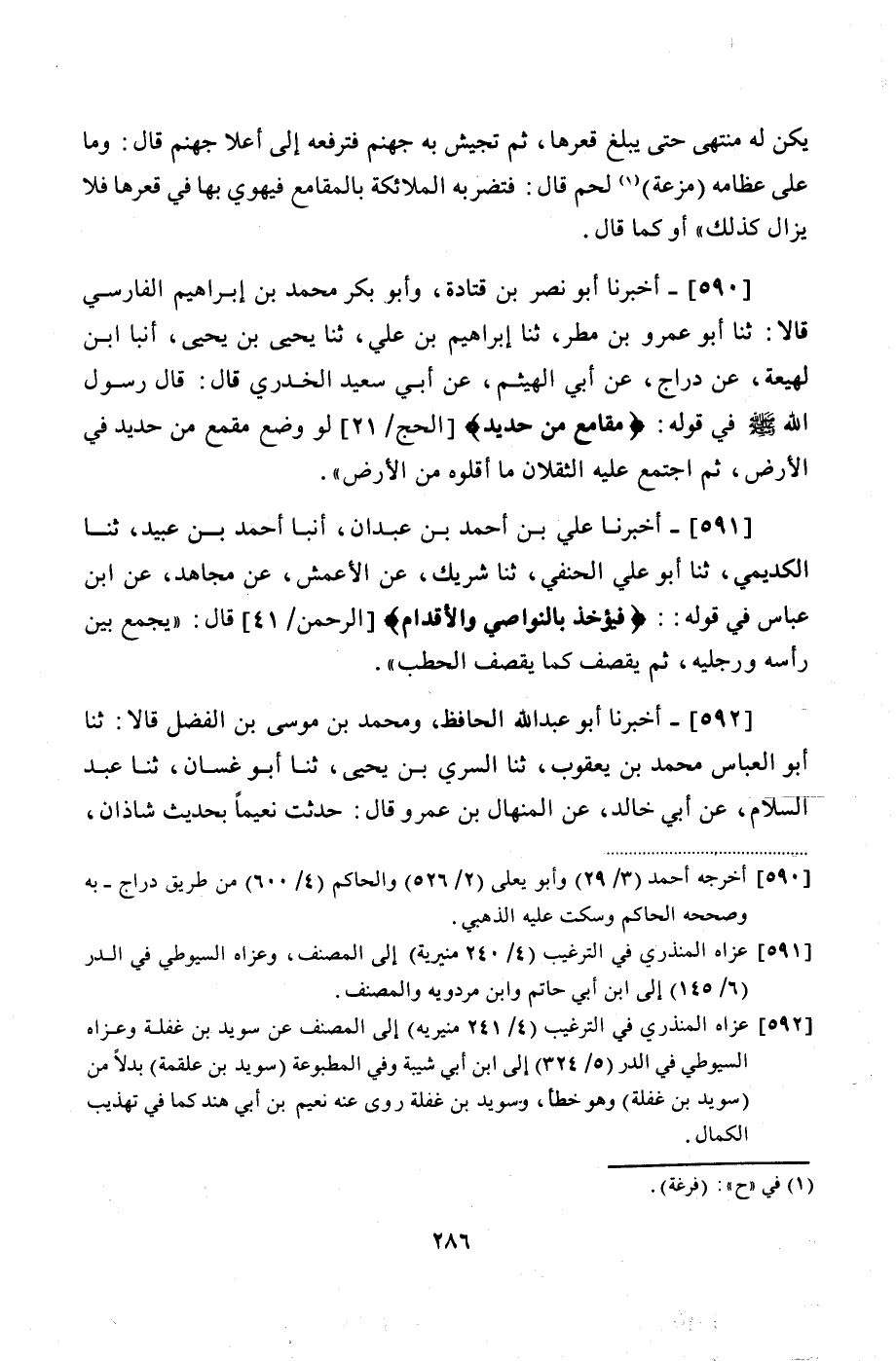 590 - (537) أَخْبَرَنَا أَبُو نَصْرِ بْنُ قَتَادَةَ، وَأَبُو بَكْرٍ مُحَمَّدُ بْنُ إِبْرَاهِيمَ الْفَارِسِيُّ، قَالَا: ثنا أَبُو عَمْرِو بْنُ مَطَرٍ، ثنا إِبْرَاهِيمُ بْنُ عَلِيٍّ، ثنا يَحْيَى بْنُ يَحْيَى، أَنْبَأَ ابْنُ لَهِيعَةَ، عَنْ دَرَّاجٍ، عَنْ أَبِي الْهَيْثَمِ، عَنْ أَبِي سَعِيدٍ الْخُدْرِيِّ، قَالَ: قَالَ رَسُولُ اللَّهِ صَلَّى اللهُ عَلَيْهِ وَسَلَّمَ، فِي قَوْلِهِ: {مَقَامِعُ مِنْ حَدِيدٍ}: «لَوْ وُضِعَ مِقْمَعٌ مِنْ حَدِيدٍ فِي الْأَرْضِ، ثُمَّ اجْتَمَعَ عَلَيْهِ الثَّقَلَانِ مَا أَقَلُّوهُ مِنَ الْأَرْضِ»