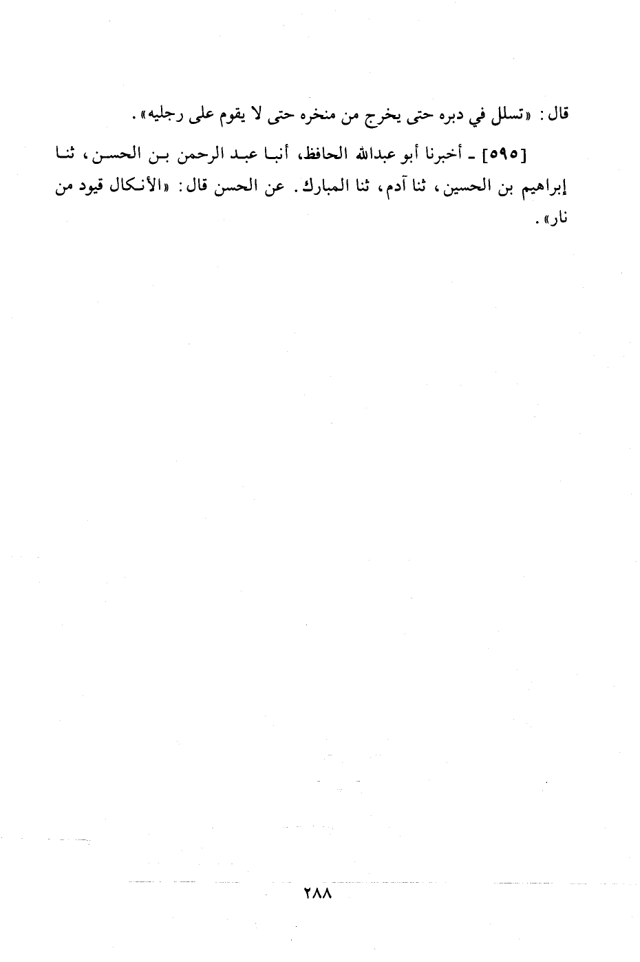 595 - (542) أَخْبَرَنَا أَبُو عَبْدِ اللَّهِ الْحَافِظُ، أَنْبَأَ عَبْدُ الرَّحْمَنِ بْنُ الْحَسَنِ، ثنا إِبْرَاهِيمُ بْنُ الْحُسَيْنِ، ثنا آدَمُ، ثنا الْمُبَارَكُ، عَنِ الْحَسَنِ، قَالَ: «الْأَنْكَالُ قُيُودٌ مِنْ نَارٍ»