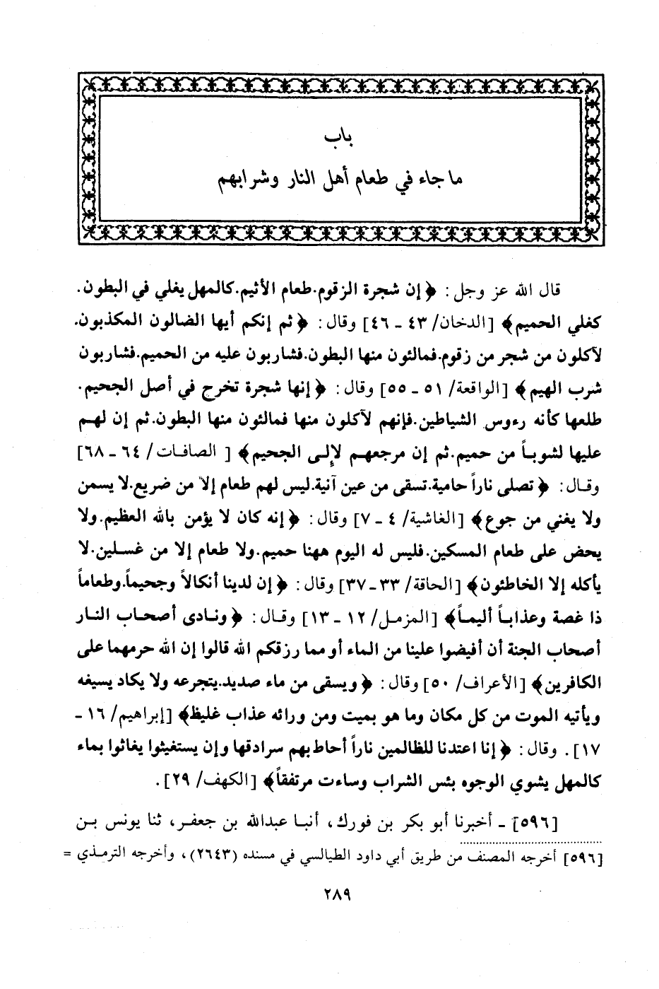قَالَ اللَّهُ عَزَّ وَجَلَّ: {إِنَّ شَجَرَةَ الزَّقُّومِ، طَعَامُ الْأَثِيمِ , كَالْمُهْلِ يَغْلِي فِي الْبُطُونُ، كَغَلْيِ الْحَمِيمِ}، وَقَالَ: {ثُمَّ إِنَّكُمْ أَيُّهَا الضَّالُّونَ الْمُكَذِّبُونِ، لَآكِلُونَ مِنْ شَجَرٍ مِنْ زَقُّومٍ، فَمَالِئُونَ مِنْهَا الْبُطُونَ، فَشَارِبُونَ عَلَيْهِ مِنَ الْحَمِيمِ، فَشَارِبُونَ شُرْبَ الْهِيمِ}، وَقَالَ: {إِنَّهَا شَجَرَةٌ تَخْرُجُ فِي أَصْلِ الْجَحِيمِ، طَلْعُهَا كَأَنَّهُ رُءُوسُ الشَّيَاطِينِ، فَإِنَّهُمْ لَآكِلُونَ مِنْهَا فَمَالِئُونَ مِنْهَا الْبُطُونَ، ثُمَّ إِنَّ لَهُمْ عَلَيْهَا لَشَوْبًا مِنْ حَمِيمٍ، ثُمَّ إِنَّ مَرْجِعَهُمُ لَإِلَى الْجَحِيمِ}، وَقَالَ: {تَصْلَى نَارًا حَامِيَةً، تُسْقَى مِنْ عَيْنٍ آنِيَةٍ، لَيْسَ لَهُمْ طَعَامٌ إِلَّا مِنْ ضَرِيعٍ، لَا يُسْمِنُ وَلَا يُغْنِي مِنْ جُوعٍ}، وَقَالَ: {إِنَّهُ كَانَ لَا يُؤْمِنُ بِاللَّهِ الْعَظِيمِ وَلَا يَحُضُّ عَلَى طَعَامِ الْمِسْكِينِ فَلَيْسَ لَهُ الْيَوْمَ هَاهُنَا حَمِيمٌ وَلَا طَعَامٌ إِلَّا مِنْ غِسْلِينٍ لَا يَاكُلُهُ إِلَّا الْخَاطِئُونَ}، وَقَالَ: {إِنَّ لَدَيْنَا أَنْكَالًا وَجَحِيمًا، وَطَعَامًا ذَا غُصَّةٍ وَعَذَابًا أَلِيمًا}، وَقَالَ: {وَنَادَى أَصْحَابُ النَّارِ أَصْحَابَ الْجَنَّةِ أَنْ أَفِيضُوا عَلَيْنَا مِنَ الْمَاءِ أَوْ مِمَّا رَزَقَكُمُ اللَّهُ قَالُوا إِنَّ اللَّهَ حَرَّمَهُمَا عَلَى الْكَافِرِينَ}، وَقَالَ: {وَيُسْقَى مِنْ مَاءٍ صَدِيدٍ، يَتَجَرَّعُهُ وَلَا يَكَادُ يُسِيغُهُ وَيَاتِيهِ الْمَوْتُ مِنْ كُلِّ مَكَانٍ وَمَا هُوَ بِمَيِّتٍ وَمِنْ وَرَائِهِ عَذَابٌ غَلِيظٌ}،وَقَالَ: {إِنَّا أَعْتَدْنَا لِلظَّالِمِينَ نَارًا أَحَاطَ بِهِمْ سُرَادِقُهَا وَإِنْ يَسْتَغِيثُوا يُغَاثُوا بِمَاءٍ كَالْمُهْلِ يَشْوِي الْوُجُوهَ بِئْسَ الشَّرَابُ وَسَاءَتْ مُرْتَفَقَا}