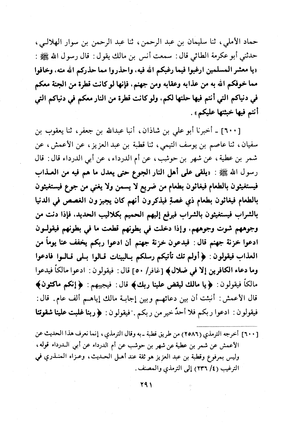 600 - (547) أَخْبَرَنَا أَبُو عَلِيِّ بْنُ شَاذَانَ، أَنْبَأَ عَبْدُ اللَّهِ بْنُ جَعْفَرٍ، ثنا يَعْقُوبُ بْنُ سُفْيَانَ، ثنا عَاصِمُ بْنُ يُوسُفَ التَّيْمِيُّ، ثنا قُطْبَةُ بْنُ عَبْدِ الْعَزِيزِ، عَنِ الْأَعْمَشِ، عَنْ شِمْرِ بْنِ عَطِيَّةَ، عَنْ شَهْرِ بْنِ حَوْشَبٍ، عَنْ أُمِّ الدَّرْدَاءِ، عَنْ أَبِي الدَّرْدَاءِ، قَالَ: قَالَ رَسُولُ اللَّهِ صَلَّى اللهُ عَلَيْهِ وَسَلَّمَ: " يُلْقَى عَلَى أَهْلِ النَّارِ الْجُوعُ، حَتَّى يَعْدِلَ مَا هُمْ فِيهِ مِنَ الْعَذَابِ، فَيَسْتَغِيثُونَ بِالطَّعَامِ، فَيُغَاثُونَ بِطَعَامٍ مِنْ ضَرِيعٍ لَا يُسْمِنُ وَلَا يُغْنِي مِنْ جُوعٍ، فَيَسْتَغِيثُونَ بِالطَّعَامِ، فَيُغَاثُونَ بِطَعَامٍ ذِي غُصَّةٍ، فَيَذْكُرُونَ أَنَّهُمْ كَانَ يُجِيزُونَ الْغُصَصَ فِي الدُّنْيَا بِالشَّرَابِ، فَيَسْتَغِيثُونَ بِالشَّرَابِ، فَيُرْفَعُ إِلَيْهِمُ الْحَمِيمُ بِكَلَالِيبِ الْحَدِيدِ، فَإِذَا دَنَتْ مِنْ وُجُوهِهِمْ شَوَتْ وُجُوهَهُمْ، وَإِذَا دَخَلَتْ فِي بُطُونِهِمْ قَطَّعَتْ مَا فِي بُطُونِهِمْ، فَيَقُولُونَ: ادْعُوا خَزَنَةَ جَهَنَّمَ "، قَالَ: " فَيَدْعُونَ خَزَنَةَ جَهَنَّمَ: أَنِ ادْعُوا رَبَّكُمْ يُخَفِّفْ عَنَّا يَوْمًا مِنَ الْعَذَابِ، فَيَقُولُونَ: {أَوَلَمْ تَكُ تَاتِيكُمْ رُسُلُكُمْ بِالْبَيِّنَاتِ قَالُوا بَلَى قَالُوا فَادْعُوا وَمَا دُعَاءُ الْكَافِرِينَ إِلَّا فِي ضَلَالٍ} "، قَالَ: " فَيَقُولُونَ: ادْعُوا مَالِكًا، فَيَدْعُونَ مَالِكًا فَيَقُولُونَ: {يَا مَالِكُ لِيَقْضِ عَلَيْنَا رَبُّكَ} "، قَالَ: " فَيُجِيبُهُمْ: {إِنَّكُمْ مَاكِثُونَ} " قَالَ الْأَعْمَشُ: أُنْبِئْتُ أَنَّ بَيْنَ دُعَائِهِمْ وَبَيْنَ إِجَابَةِ مَالِكٍ إِيَّاهُمْ أَلْفَ عَامٍ، قَالَ: " فَيَقُولُونَ: ادْعُوا رَبَّكُمْ، فَلَا أَحَدَ خَيْرٌ مِنْ رَبِّكُمْ، فَيَقُولُونَ: {رَبَّنَا غَلَبَتْ عَلَيْنَا شِقْوَتُنَا #292# وَكُنَّا قَوْمًا ضَالِّينَ، رَبَّنَا أَخْرِجْنَا مِنْهَا، فَإِنْ عُدْنَا فَإِنَّا ظَالِمُونَ} "، قَالَ: " فَيُجِيبُهُمْ: {اخْسَئُوا فِيهَا وَلَا تُكَلِّمُونِ} "، قَالَ: «فَعِنْدَ ذَلِكَ يَئِسُوا مِنْ كُلِّ خَيْرٍ، وَعِنْدَ ذَلِكَ أَخَذُوا مِنَ الزَّفِيرِ وَالْحَسْرَةِ وَالْوَيْلِ»