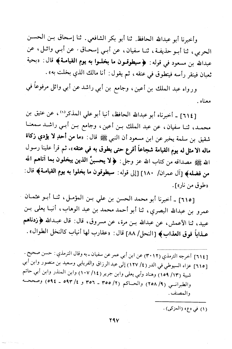 614 - (559) أَخْبَرَنَاهُ أَبُو عَبْدِ اللَّهِ الْحَافِظُ، أَنْبَأَ أَبُو عَلِيٍّ الْمُذَكِّرُ، عَنْ عَتِيقِ بْنِ مُحَمَّدٍ، ثنا سُفْيَانُ، عَنْ عَبْدِ الْمَلِكِ بْنِ أَعْيَنَ، وَجَامِعِ بْنِ أَبِي رَاشِدٍ، سَمِعْنَا شَقِيقَ بْنَ سَلَمَةَ يُخْبِرُ عَنِ ابْنِ مَسْعُودٍ، أَنَّ النَّبِيَّ صَلَّى اللهُ عَلَيْهِ وَسَلَّمَ قَالَ: «مَا مِنْ أَحَدٍ لَا يُؤَدِّي زَكَاةَ مَالِهِ إِلَّا مُثِّلَ لَهُ يَوْمَ الْقِيَامَةِ شُجَاعًا أَقْرَعَ، حَتَّى يُطَوَّقَ بِهِ فِي عُنُقِهِ»، ثُمَّ قَرَأَ عَلَيْنَا رَسُولُ اللَّهِ صَلَّى اللهُ عَلَيْهِ وَسَلَّمَ مِصْدَاقَهُ مِنْ كِتَابِ اللَّهِ عَزَّ وَجَلَّ: {لَا يَحْسَبَنَّ الَّذِينَ يَبْخَلُونَ بِمَا آتَاهُمُ اللَّهُ مِنْ فَضْلِهِ} إِلَى قَوْلِهِ: {سَيُطَوَّقُونَ مَا بَخِلُوا بِهِ يَوْمَ الْقِيَامَةِ}، قَالَ: طَوْقٌ مِنْ نَارٍ "