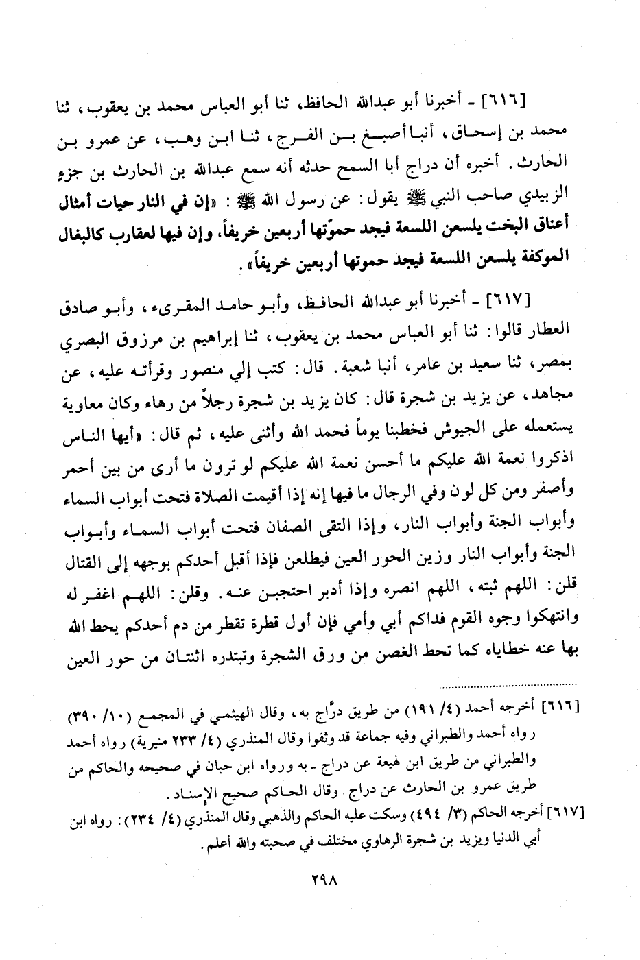 616 - (561) أَخْبَرَنَا أَبُو عَبْدِ اللَّهِ الْحَافِظُ، ثنا أَبُو الْعَبَّاسِ مُحَمَّدُ بْنُ يَعْقُوبَ، ثنا مُحَمَّدُ بْنُ إِسْحَاقَ، أَنْبَأَ أَصْبَغُ بْنُ الْفَرَجِ، ثنا ابْنُ وَهْبٍ، عَنْ عَمْرِو بْنِ الْحَارِثِ، أَخْبَرَهُ، أَنَّ دَرَّاج أَبَا السَّمْحِ حَدَّثَهُ، أَنَّهُ سَمِعَ عَبْدَ اللَّهِ بْنَ الْحَارِثِ بْنِ جَزْءٍ الزُّبَيْدِيَّ، صَاحِبَ النَّبِيِّ صَلَّى اللهُ عَلَيْهِ وَسَلَّمَ، يَقُولُ: عَنْ رَسُولِ اللَّهِ صَلَّى اللهُ عَلَيْهِ وَسَلَّمَ: «إِنَّ فِي النَّارِ حَيَّاتٍ أَمْثَالَ أَعْنَاقِ الْبُخْتِ، يَلْسَعْنَ اللَّسْعَةَ فَيَجِدُ حَمْوَتَهَا أَرْبَعِينَ خَرِيفًا، وَإِنَّ فِيهَا لَعَقَارِبَ كَالْبِغَالِ الْمُوكَفَةِ، يَلْسَعْنَ اللَّسْعَةَ فَيَجِدُ حَمْوَتَهَا أَرْبَعِينَ خَرِيفًا»