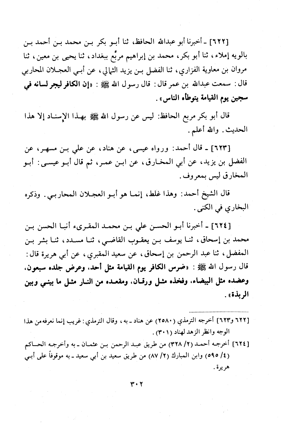 622 - (567) أَخْبَرَنَا أَبُو عَبْدِ اللَّهِ الْحَافِظُ، ثنا أَبُو بَكْرِ بْنُ مُحَمَّدِ بْنِ أَحْمَدَ بْنِ بَالَوَيْهِ، إِمْلَاءً، ثنا أَبُو بَكْرٍ مُحَمَّدُ بْنُ إِبْرَاهِيمَ مِرْبَعٌ بِبَغْدَادَ، ثنا يَحْيَى بْنُ مَعِينٍ، ثنا مَرْوَانُ بْنُ مُعَاوِيَةَ الْفَزَارِيُّ، ثنا الْفَضْلُ بْنُ يَزِيدَ الثُّمَالِيُّ، عَنْ أَبِي الْعَجْلَانِ الْمُحَارِبِيِّ، قَالَ: سَمِعْتُ عَبْدَ اللَّهِ بْنَ عُمَرَ، قَالَ: قَالَ رَسُولُ اللَّهِ صَلَّى اللهُ عَلَيْهِ وَسَلَّمَ: «إِنَّ الْكَافِرَ لَيَجُرُّ لِسَانَهُ فِي سِجِّينٍ يَوْمَ الْقِيَامَةِ يَتَوَطَّأهُ النَّاسُ»